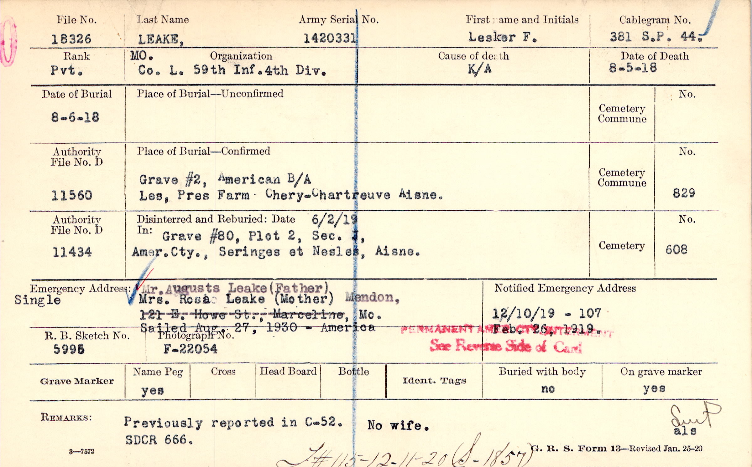 Grave #2, American B/A/. Les, Pres Farm, Chery-Chartreuve, Aisne