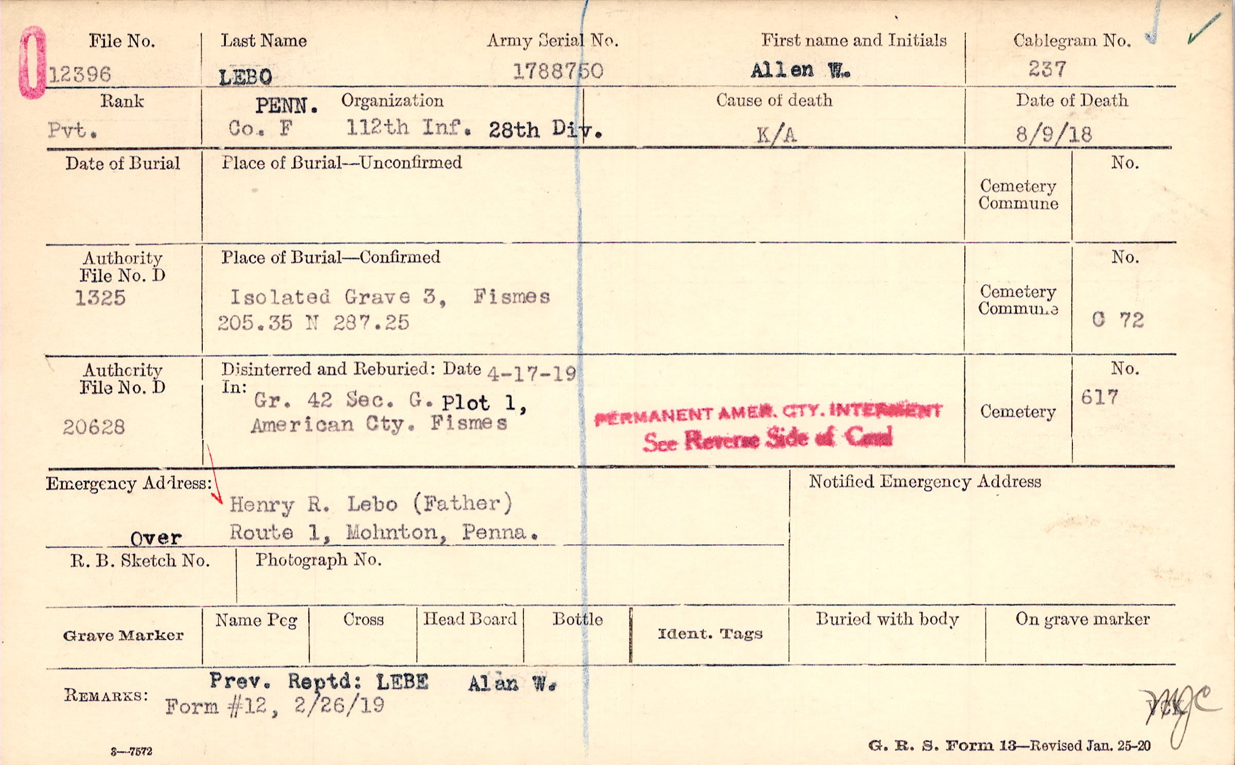Prev. Reptd.: LEBE Alan W., Form #12, 2/26/19
