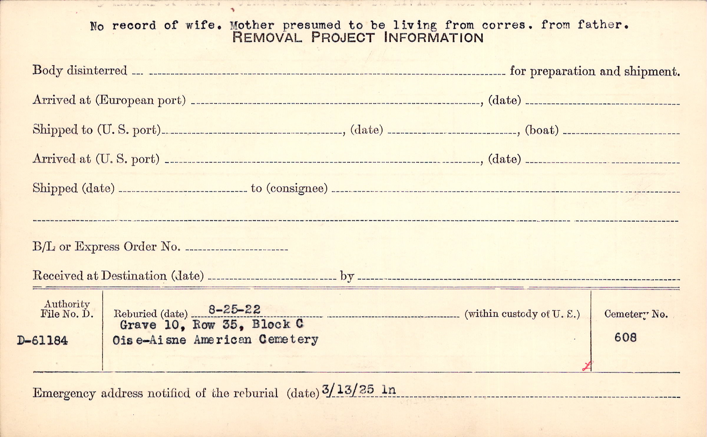 No record of wife. Mother presumed to be living from corres. from father. |