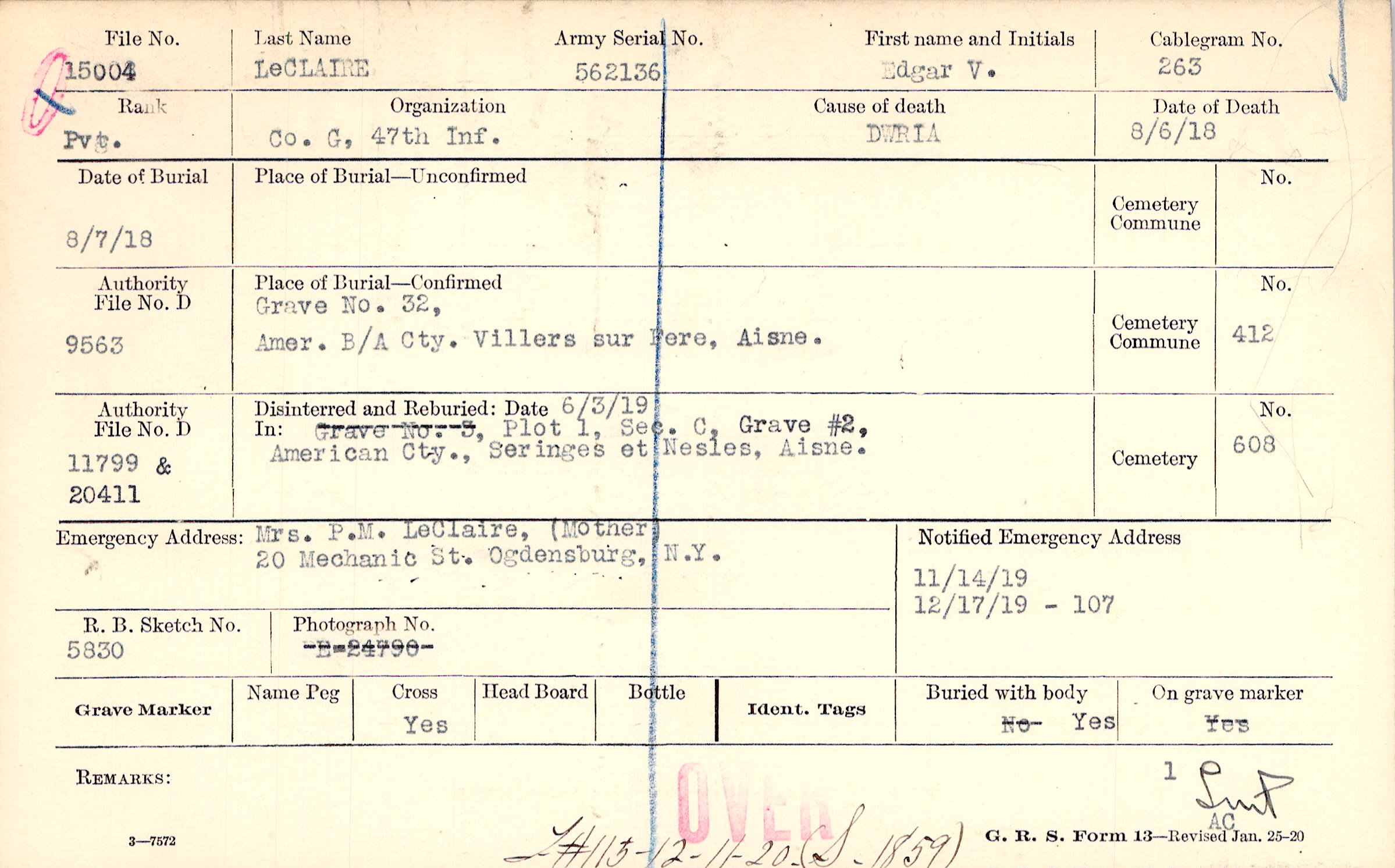 Mrs. P.M. LeClaire, (Mother), 20 Mechanic St. Ogdensburg, N.Y.