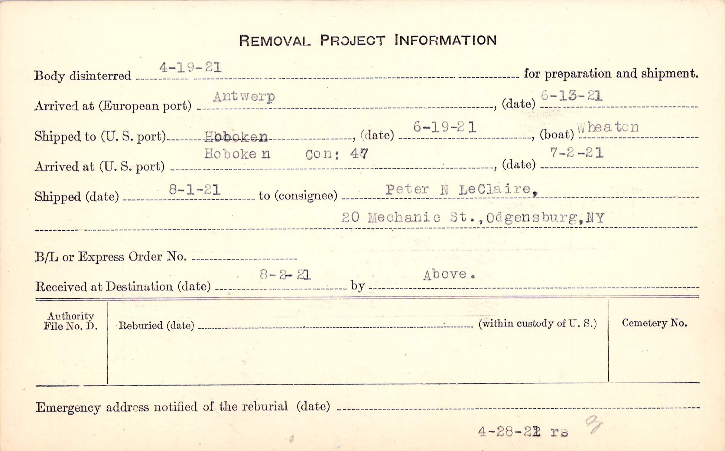 Body disinterred 4/19/1921 for preparation and shipment.