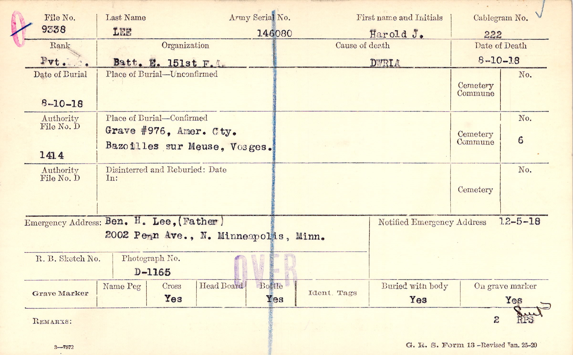 Grave #976, Amer. Cty., Bazoilles sur Meuse, Vosges.