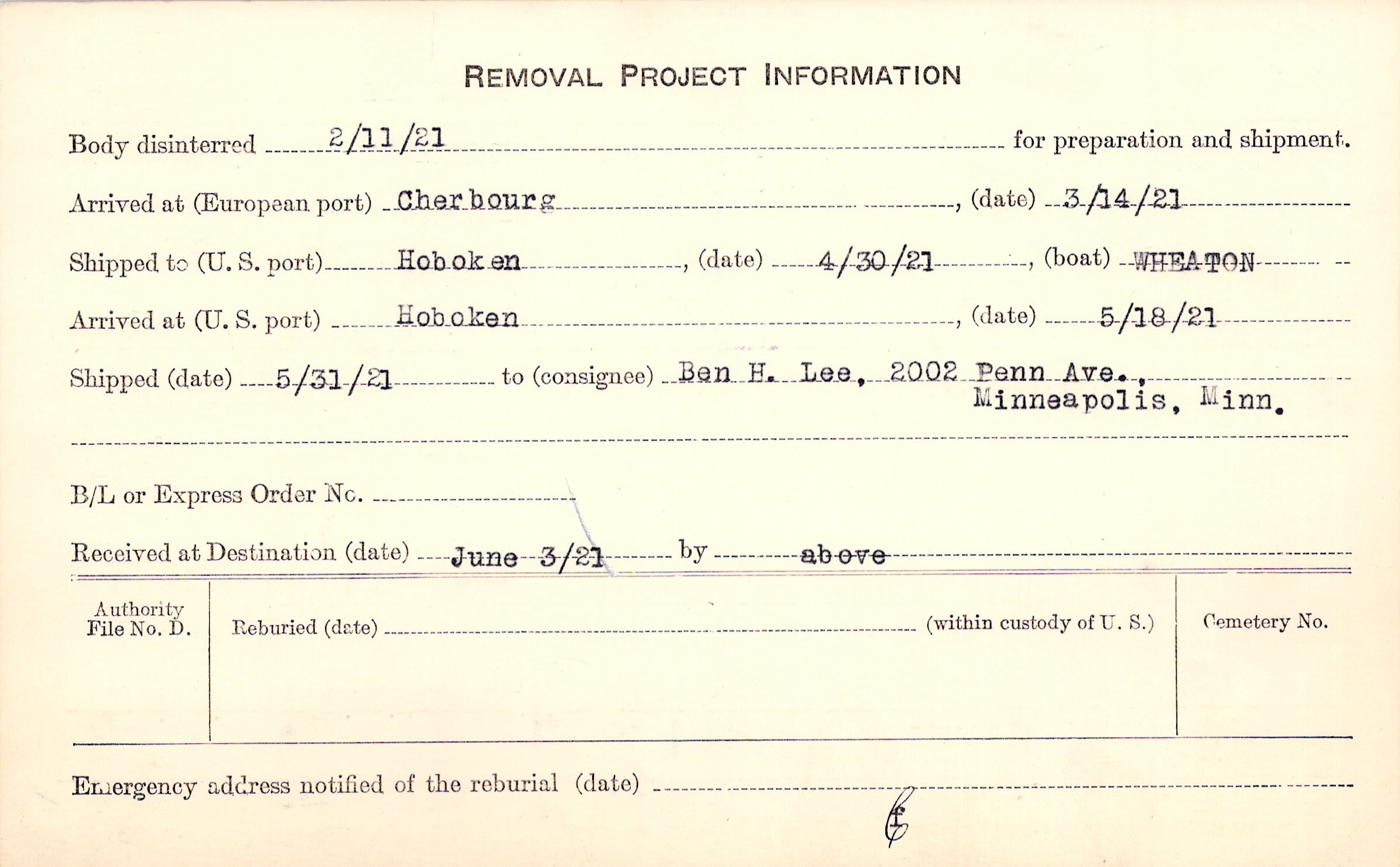 Body disinterred 2/11/1921 for preparation and shipment.
