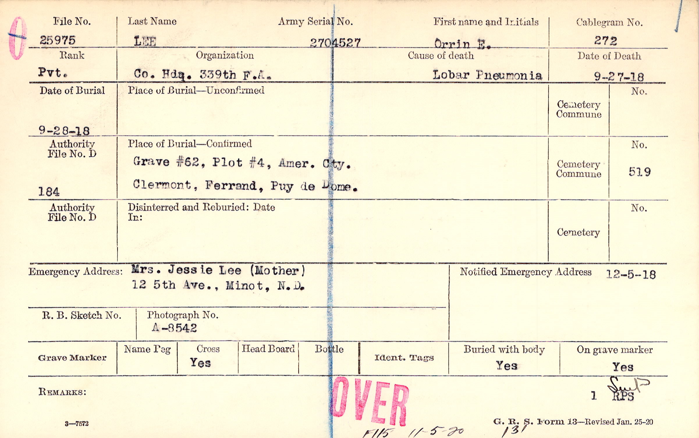 Grave #62, Plot #4, Amer. Cty. Clermont, Ferrand, Puy de Dome.