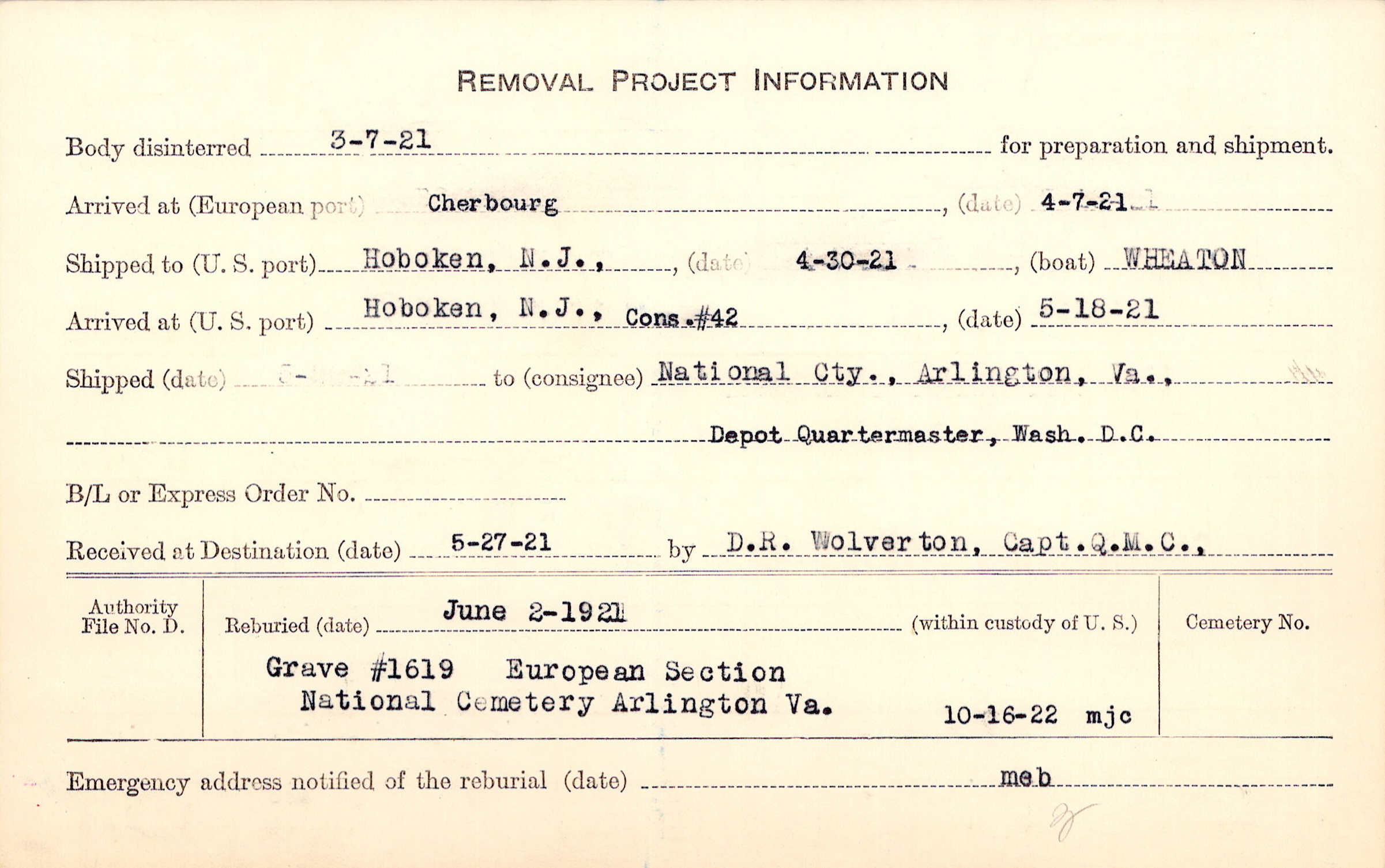 to National Cty., Arlington, Va., Depot Quartermaster, Wash. D.C.