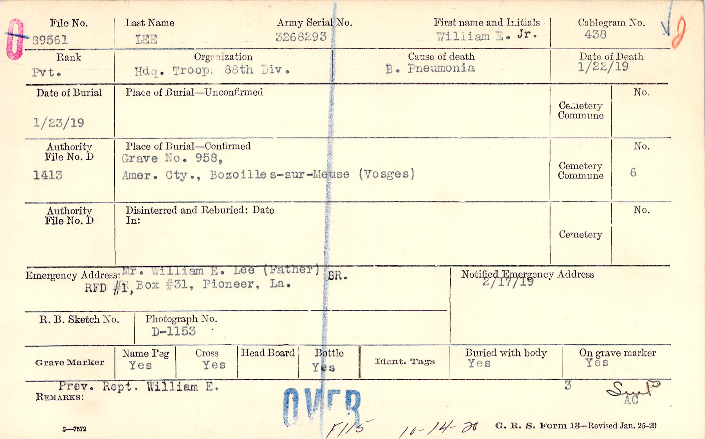 Mr. William E. Lee (Father) Sr., RFD #1, Box #31, Pioneer, La.