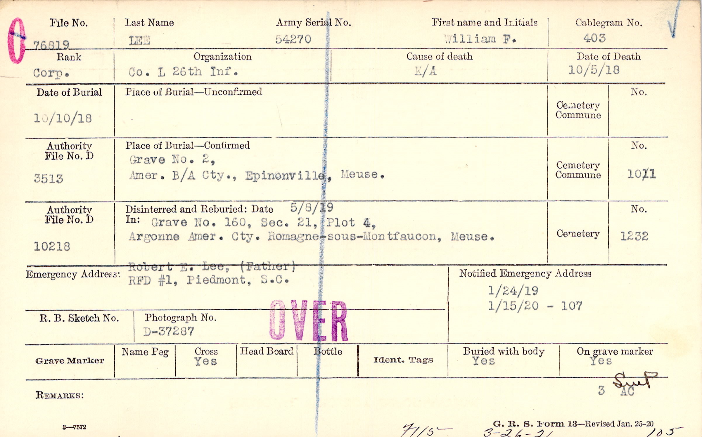 Grave 160, Section 21, Plot 4, Argonne American Cemetery, Romagne-sous-Montfaucon, Meuse