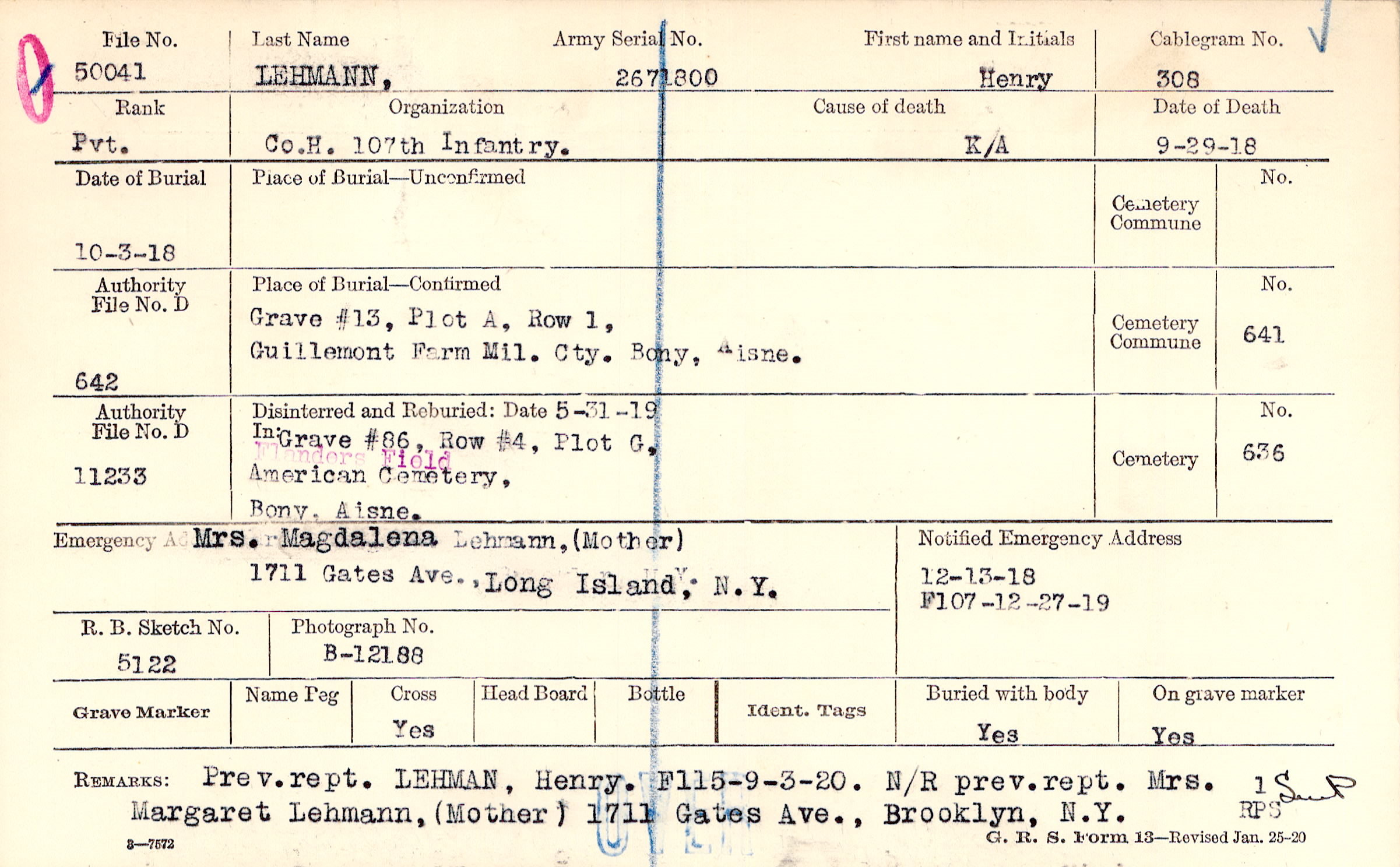 Mrs. Magdalena Lehmann, (Mother), 1711 Gates Ave., Long Island, N.Y.