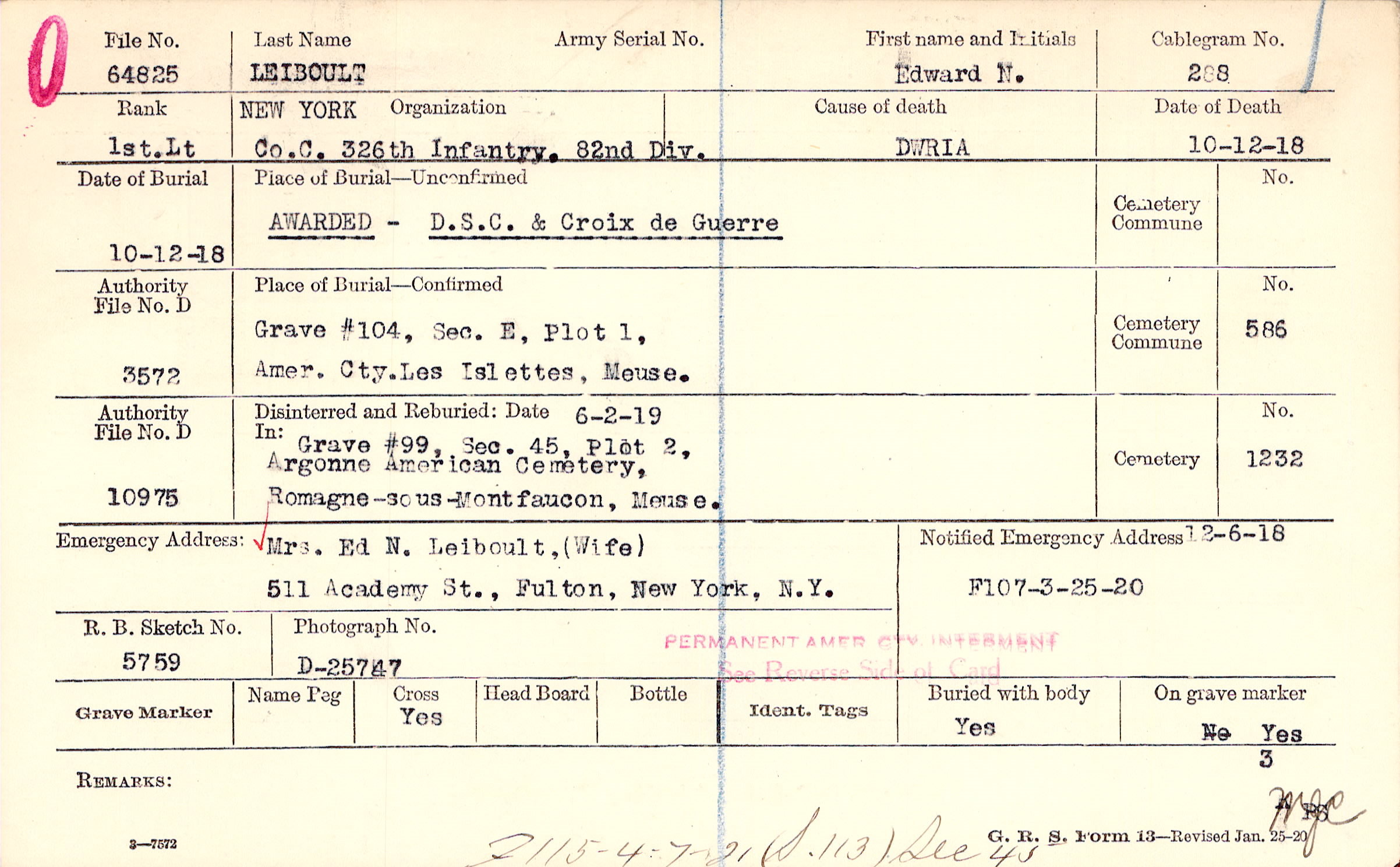 Mrs. Ed N. Leiboult, (Wife), 511 Academy St., Fulton, New York, N.Y.