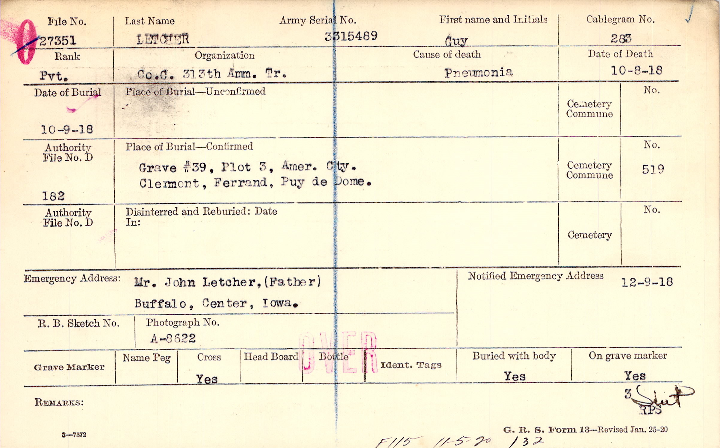 Grave #39, Plot 3, Amer. Cty., Clermont, Ferrand, Puy de Dome.