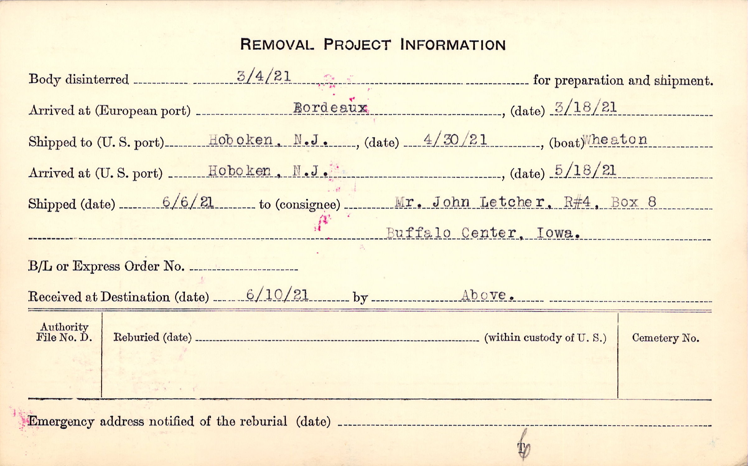Body disinterred 3/4/1921 for preparation and shipment.