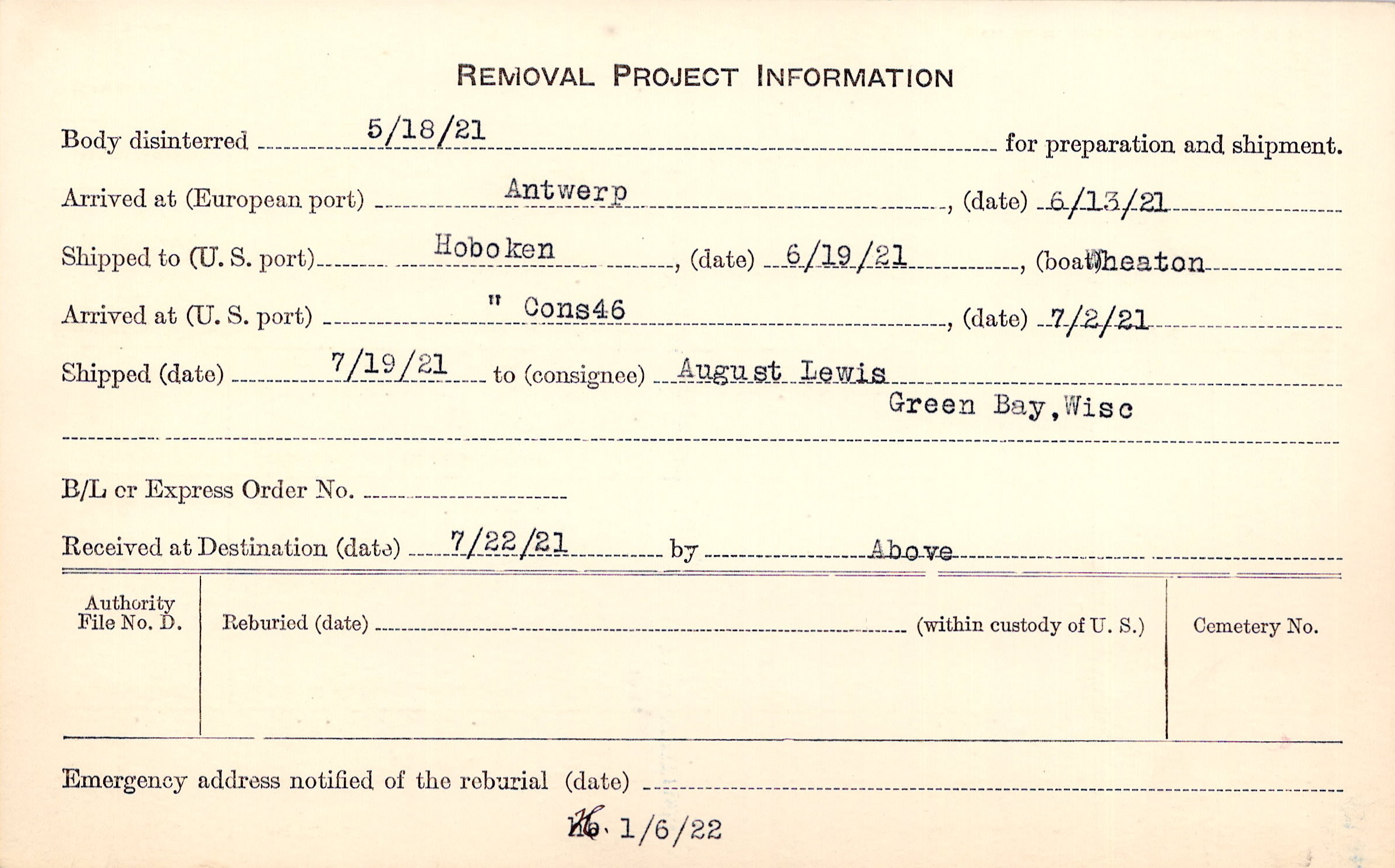 Body disinterred 5/18/1921 for preparation and shipment.