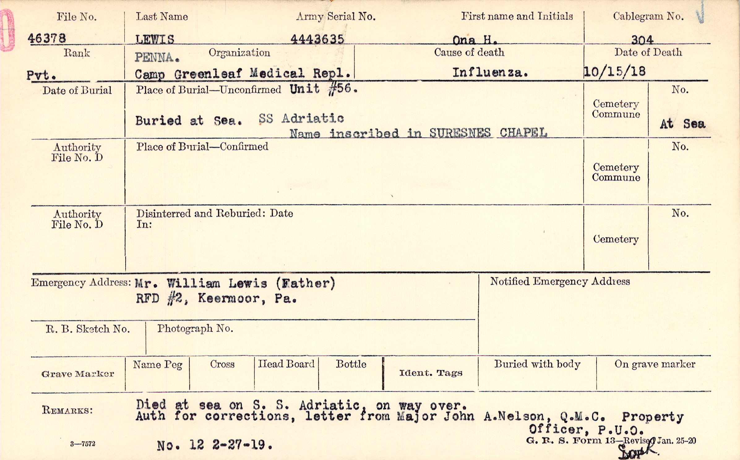 Buried at Sea. SS Adriatic, Name inscribed in SURESNES CHAPEL
