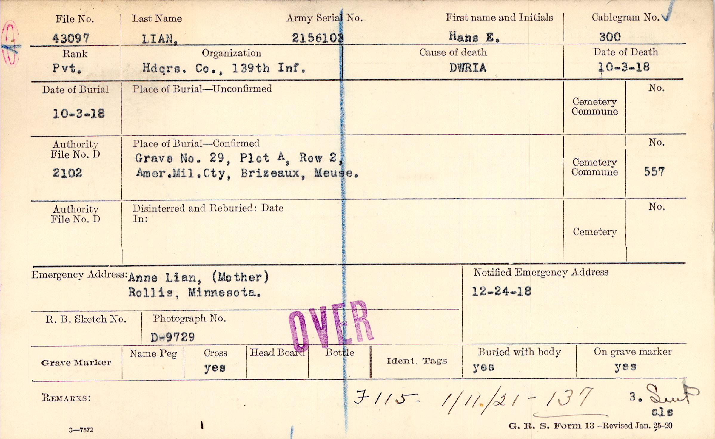 Grave 29, Plot A, Row 2, Amer. Mil. Cty, Brizeaux, Meuse.
