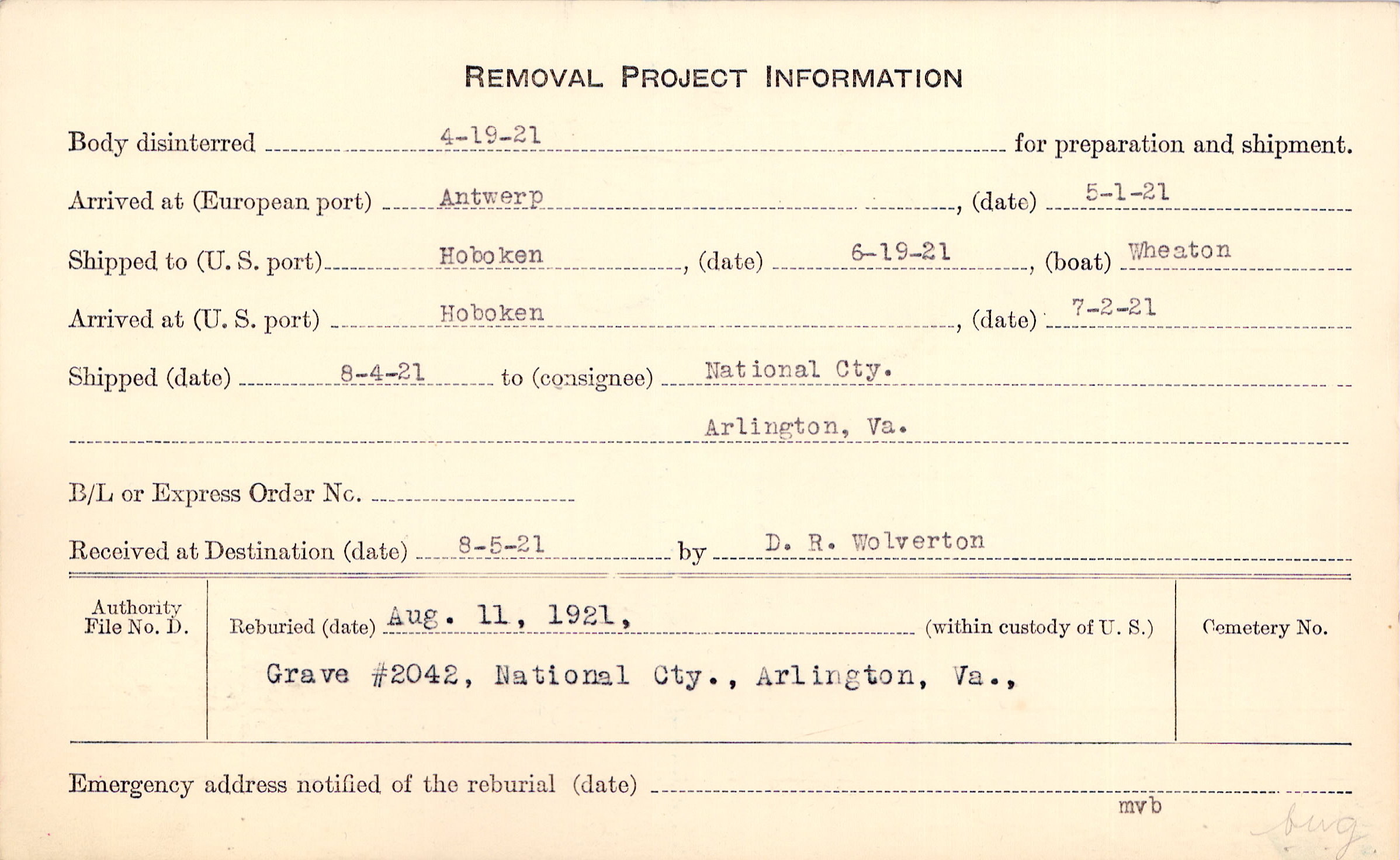 Body disinterred 4/19/1921 for preparation and shipment.
