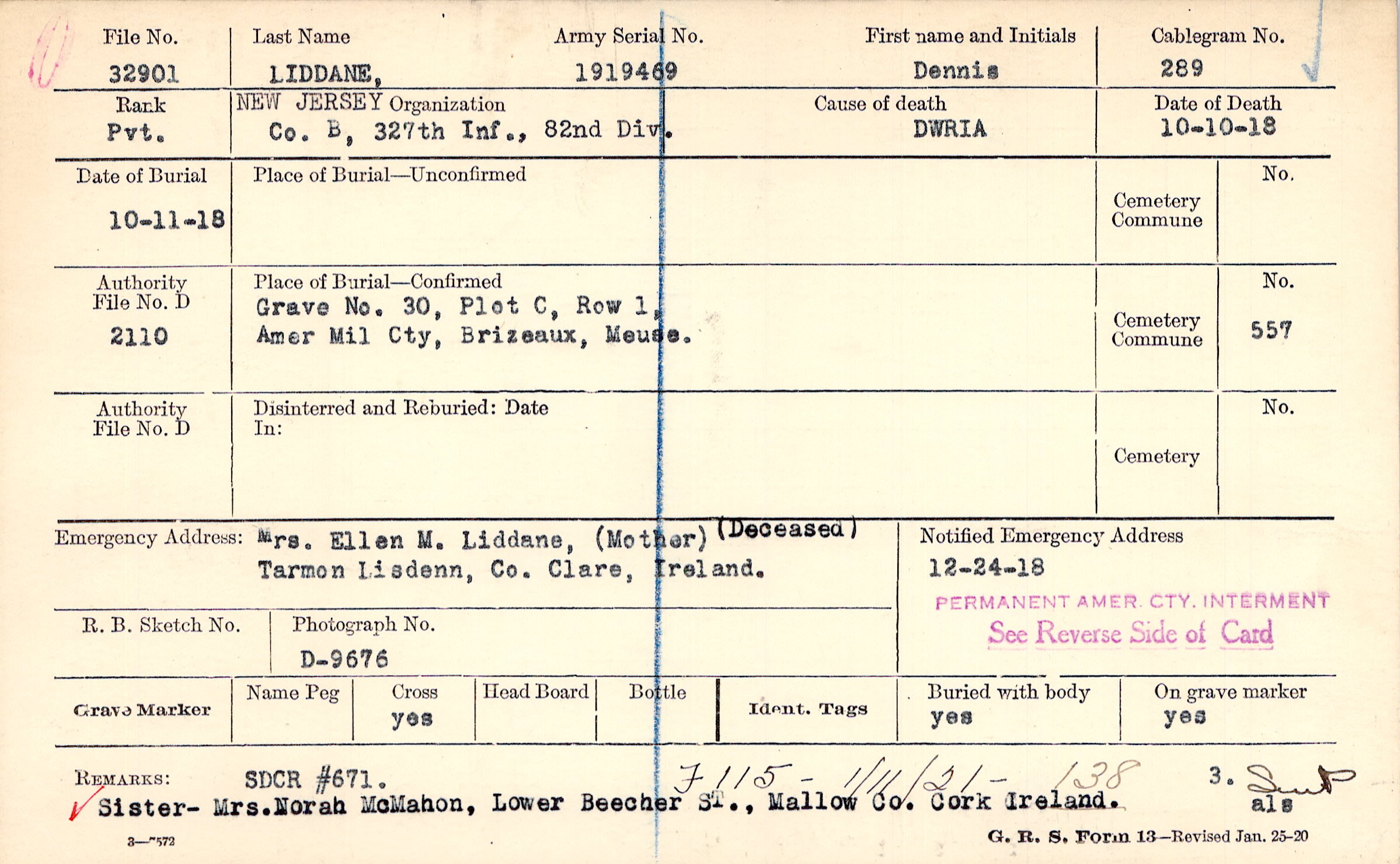 Mrs. Ellen M. Liddane, (Mother), Tarmon Lisdenn, Co. Clare, Ireland, (Deceased)
