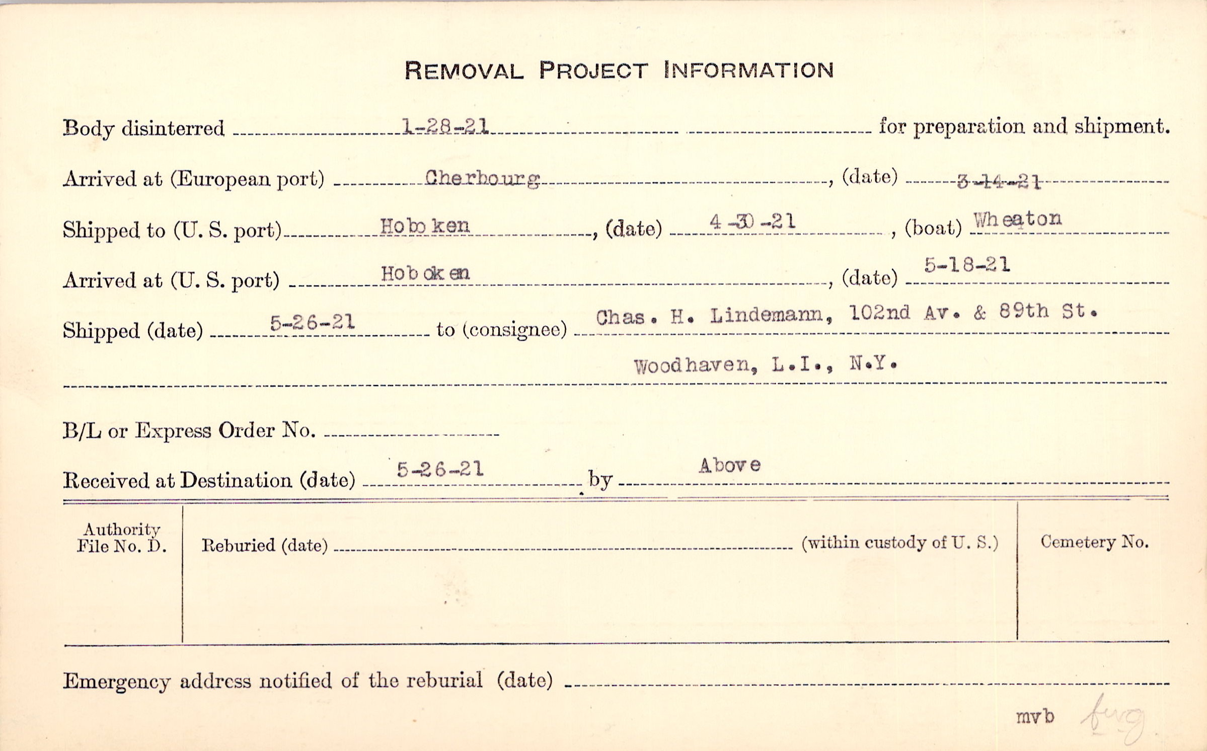 Body disinterred 1/28/1921 for preparation and shipment.