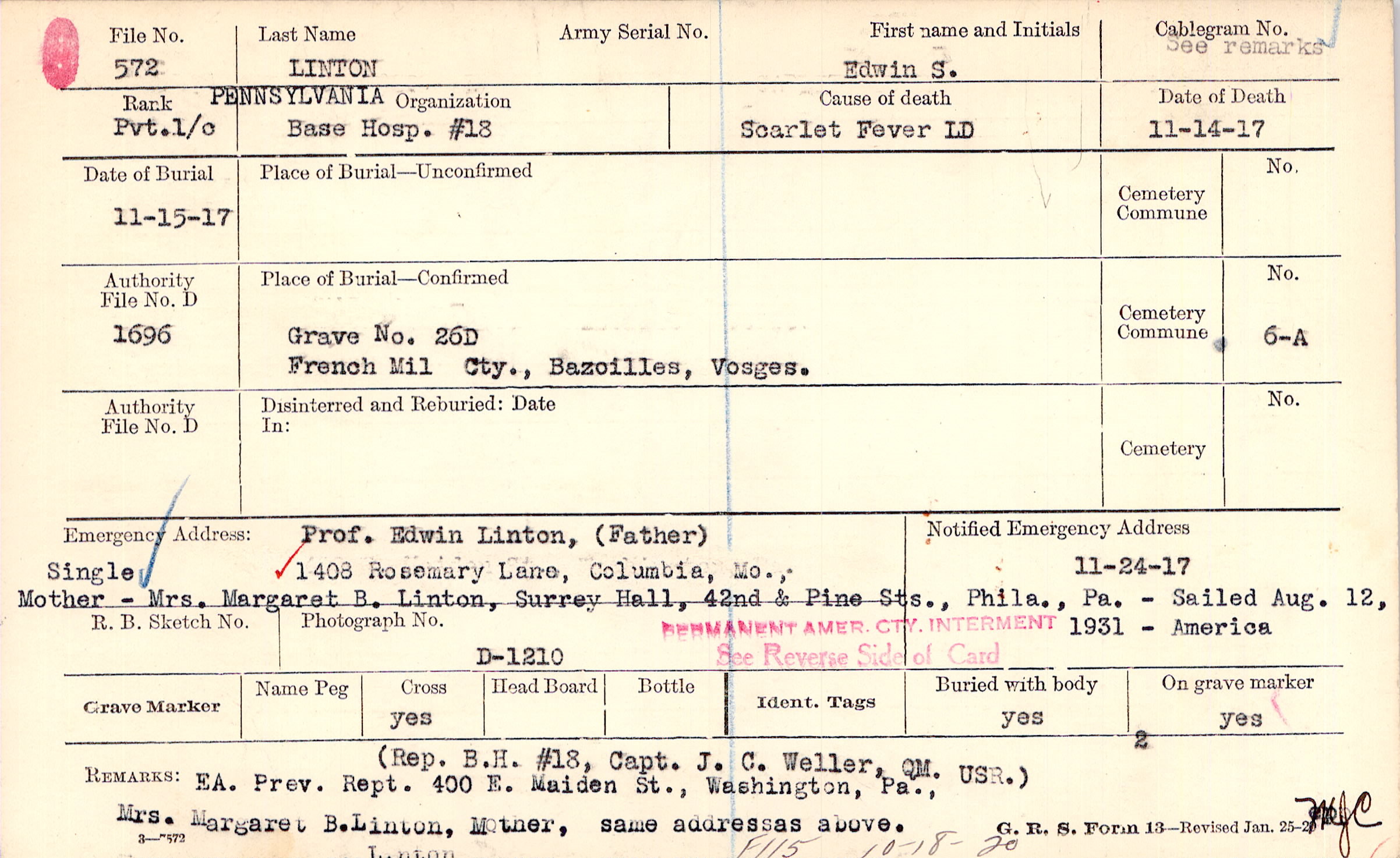 (Rep. B.H. #18, Capt. J.C. Weller, QM. USR.) EA. Prev. Rept. 400 E. Maiden St., Washington, Pa., Mrs. Margaret B. Linton, Mother, same address as above., F115 10-18-20