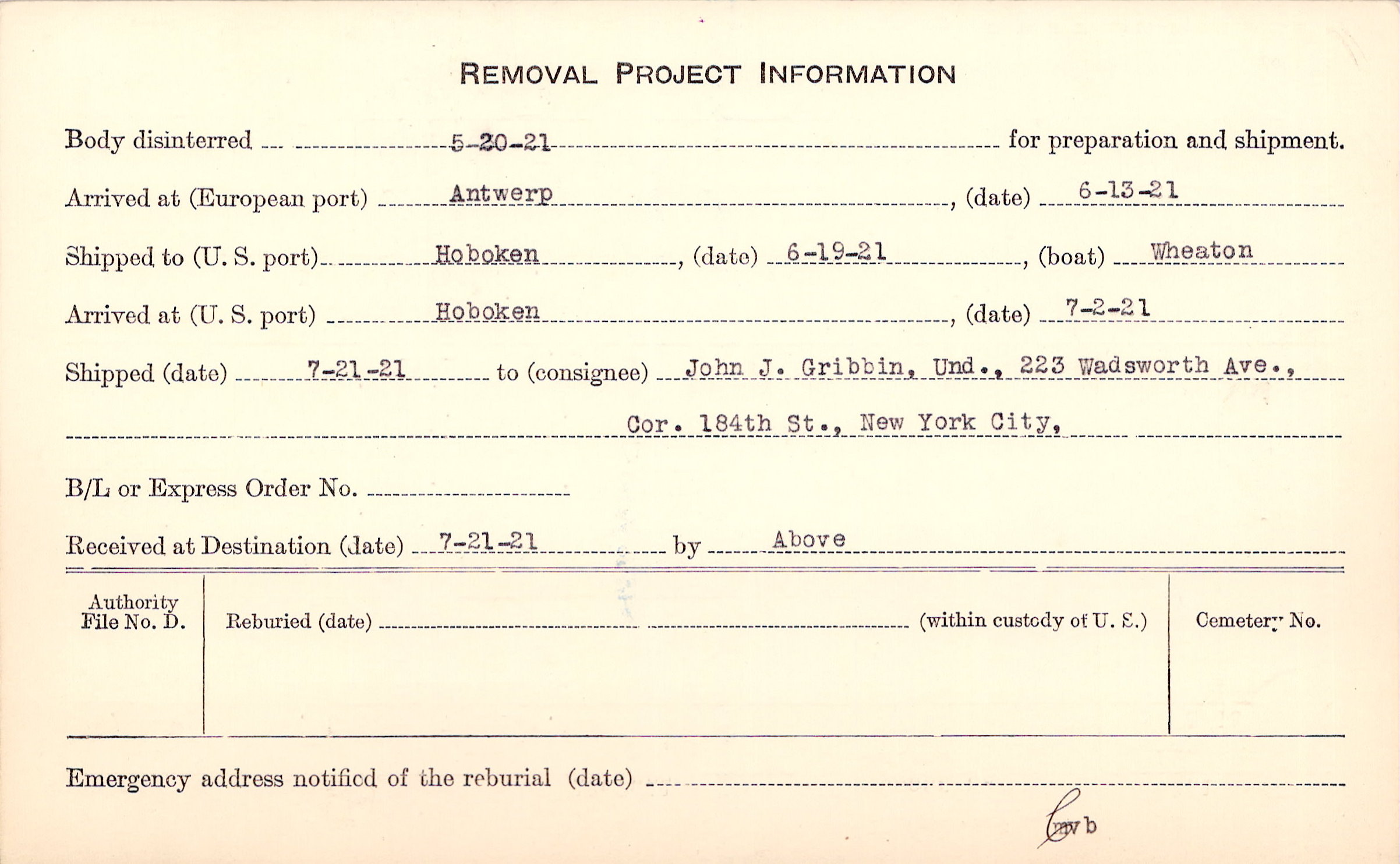Body disinterred 5/20/1921 for preparation and shipment.