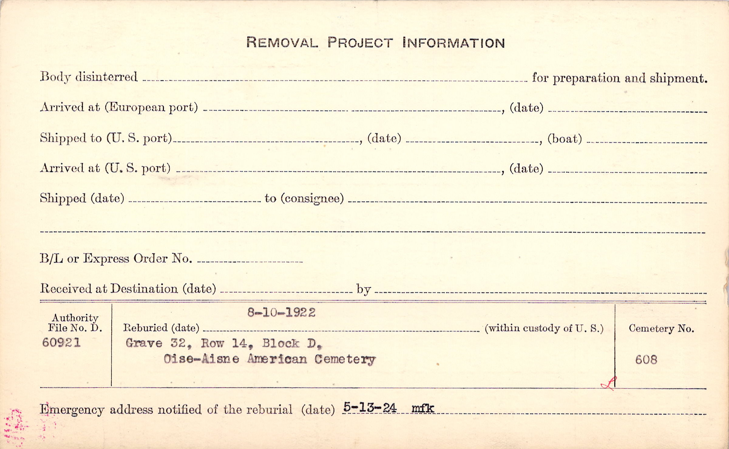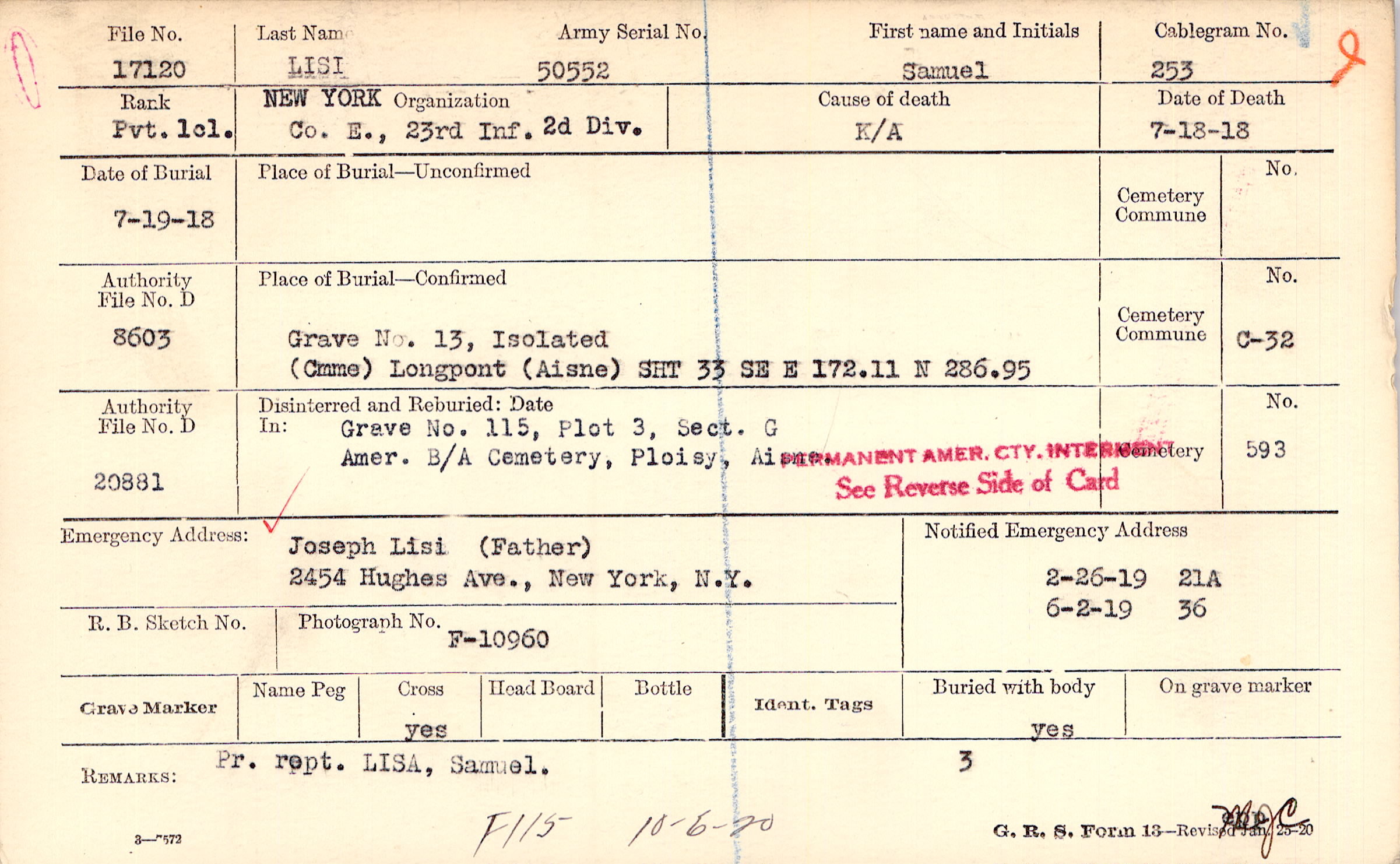 Grave 115, Section G, Plot 3, American B/A Cemetery, Ploisy, Aisne