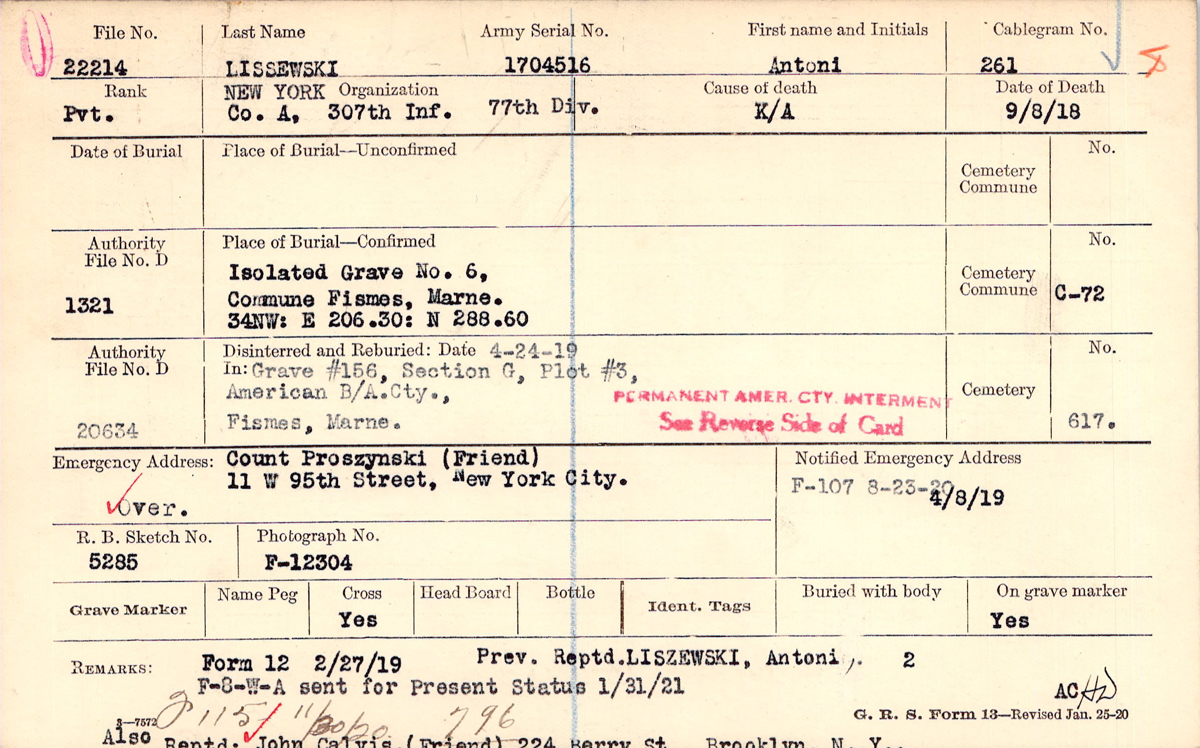 Prev. Reptd. LISZEWSKI, Antoni Also Reptd. John Calvis (Friend) 224 Berry St., Brooklyn, N.Y., F-8-W-A sent for Present Status 1/31/21, Form 12 2/27/19, F115 11/30/20 796