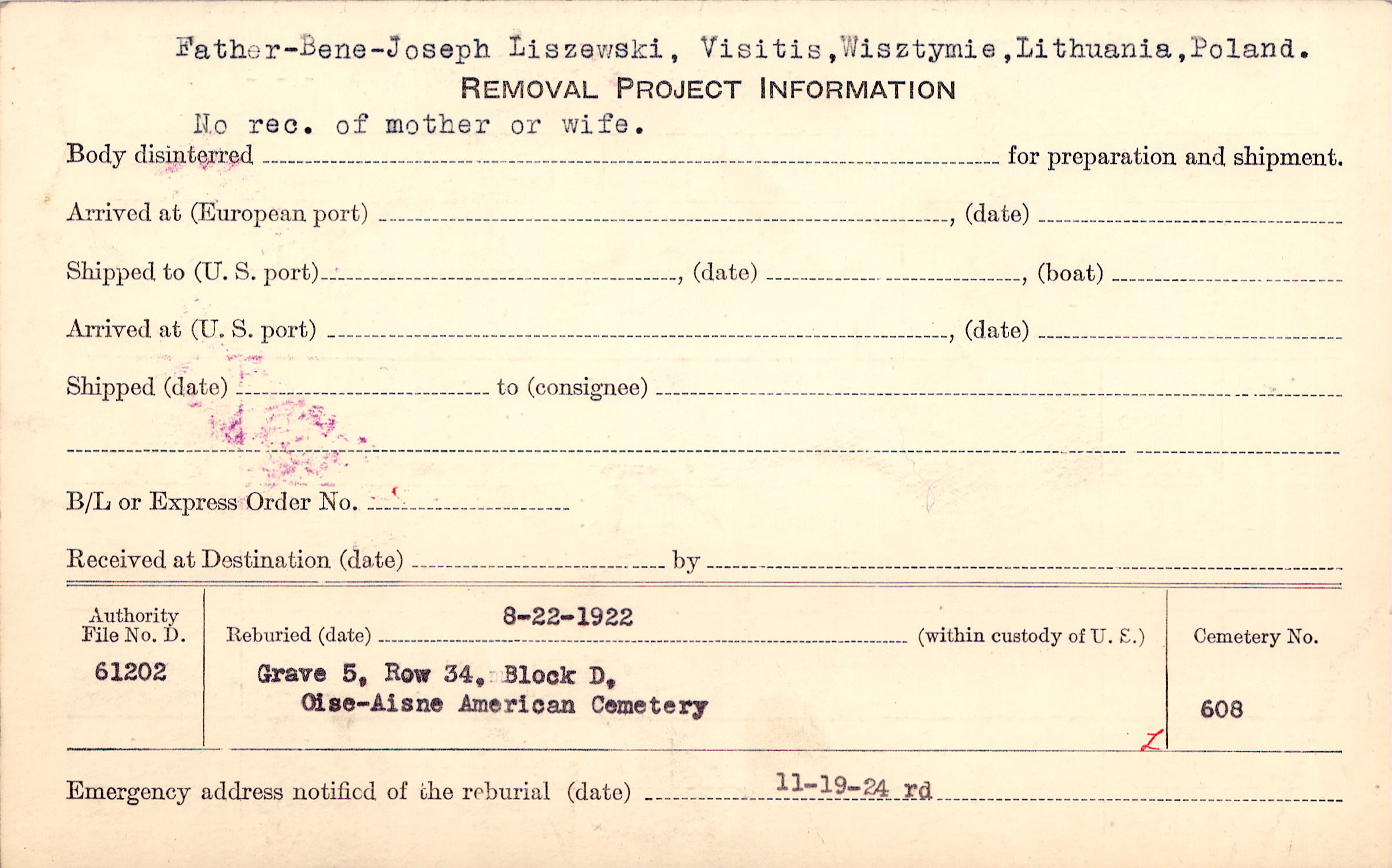 Father - Bene - Joseph Liszewski, Visitis, Wisztymie, Lithuania, Poland. No rec. of mother or wife. |