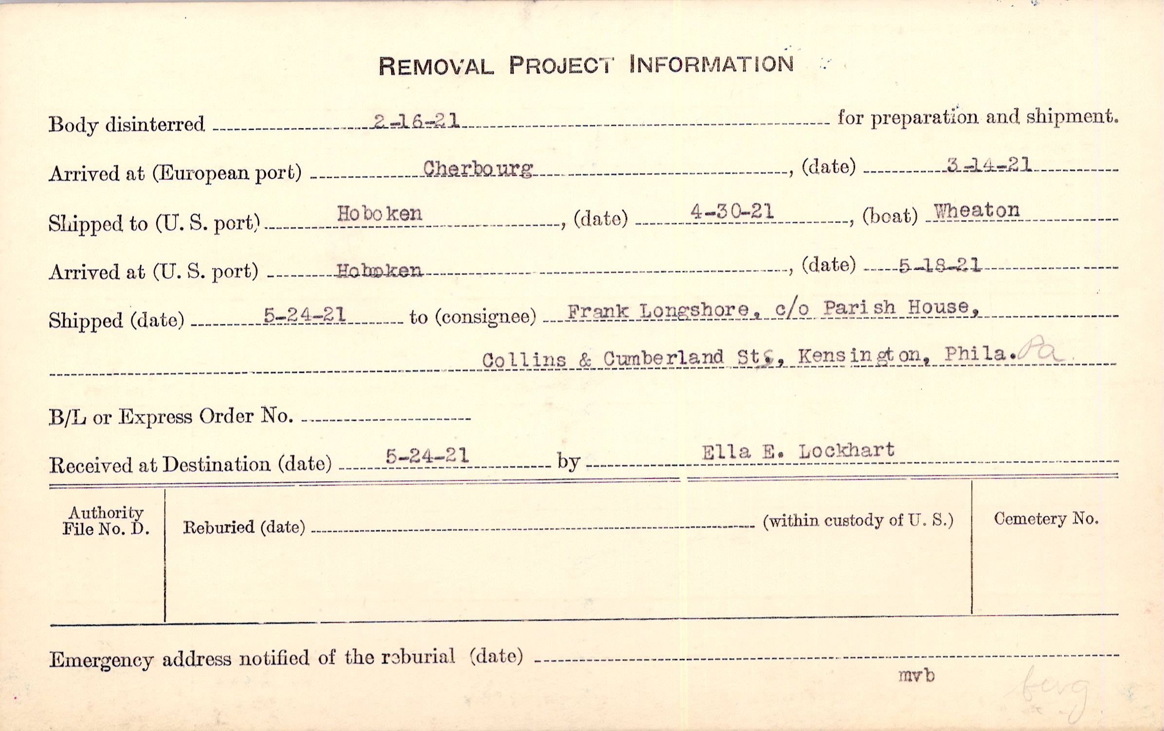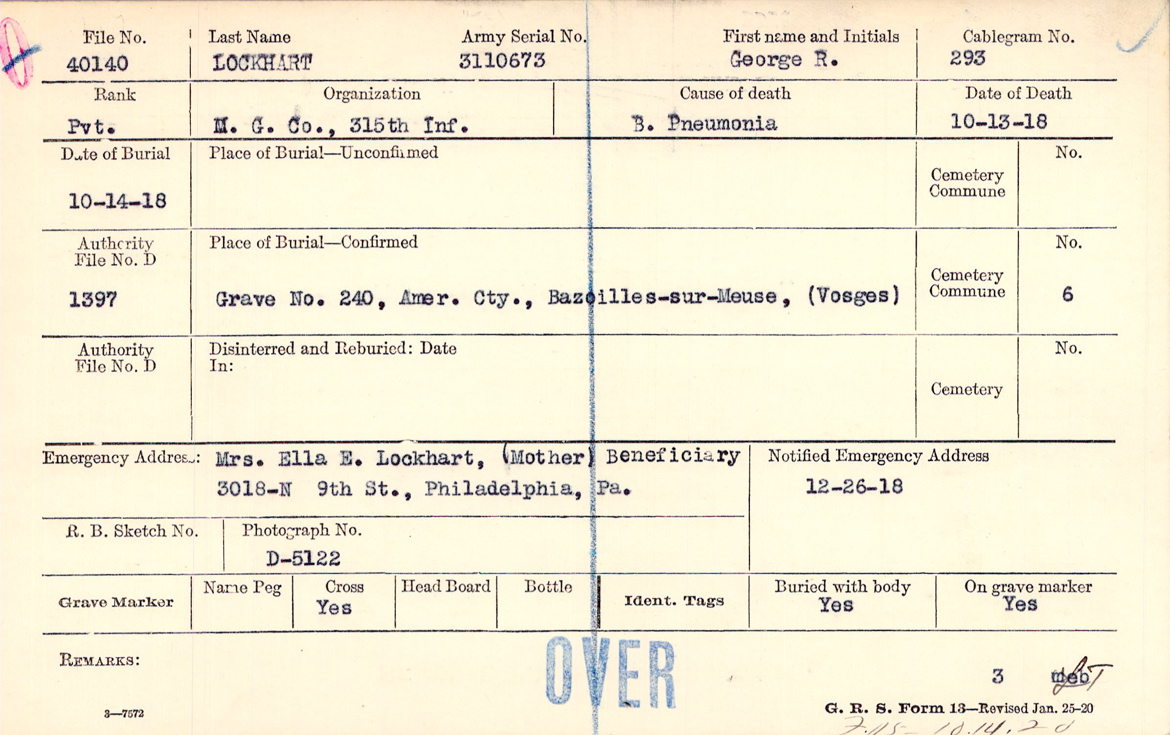 Mrs. Ella E. Lockhart, (Mother), 3018-N 9th St., Philadelphia, Pa., Beneficiary