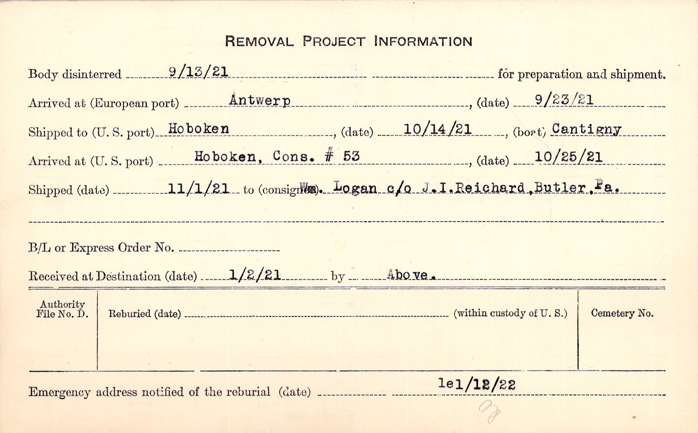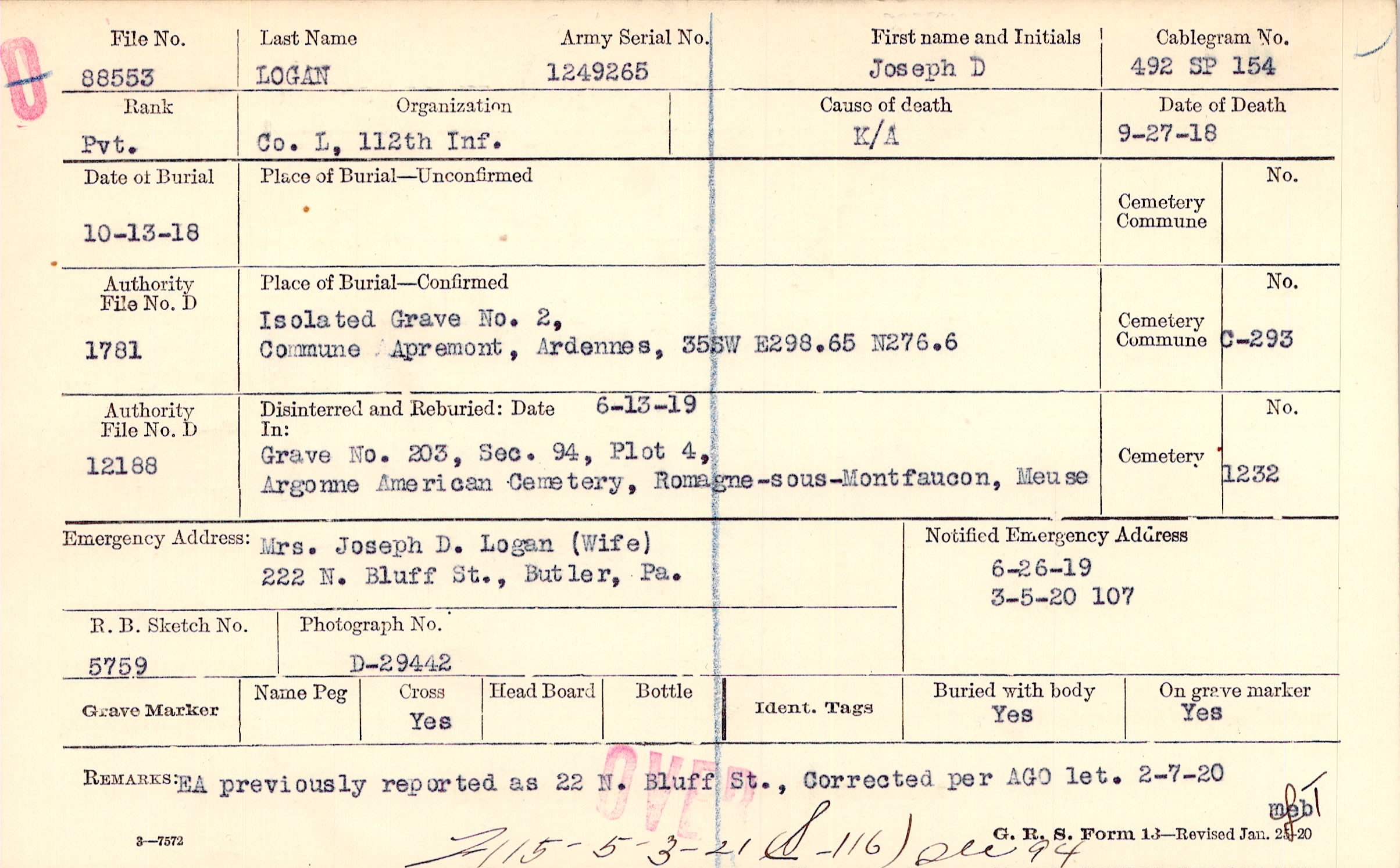 Mrs. Joseph D. Logan (Wife), 222 N. Bluff St., Butler, Pa.