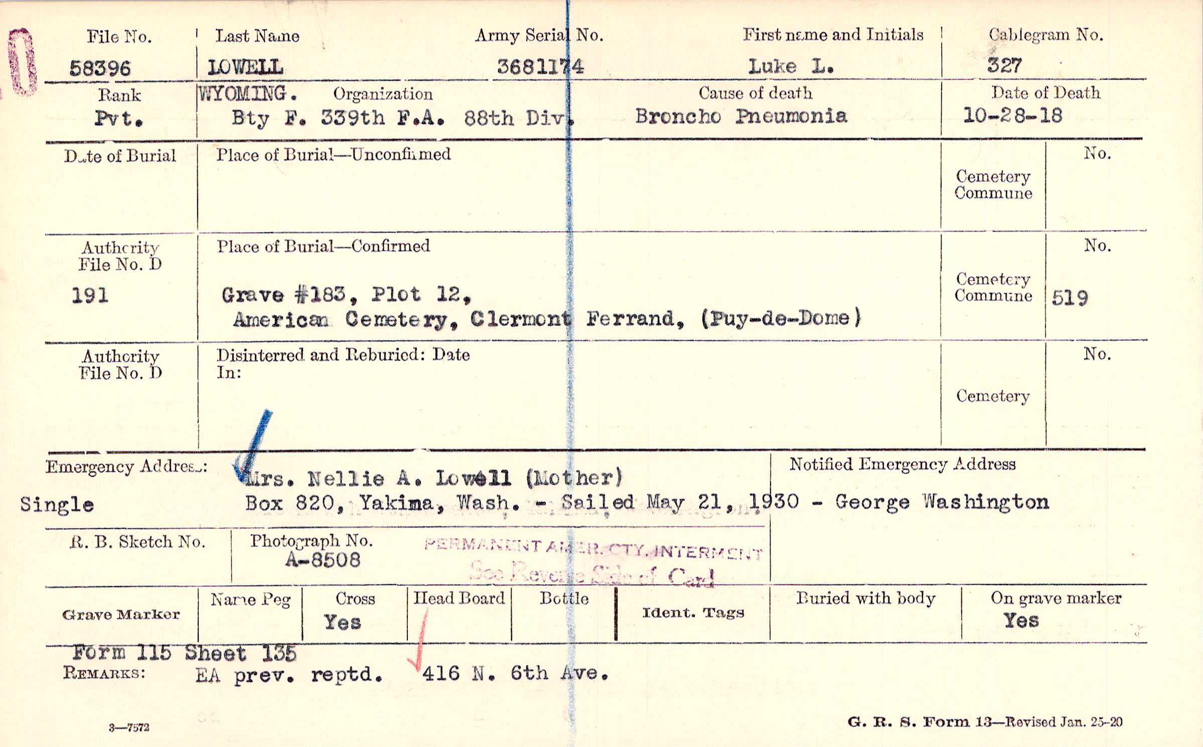 Grave #183, Plot 12, American Cemetery, Clermont Ferrand, (Puy-de-Dome )