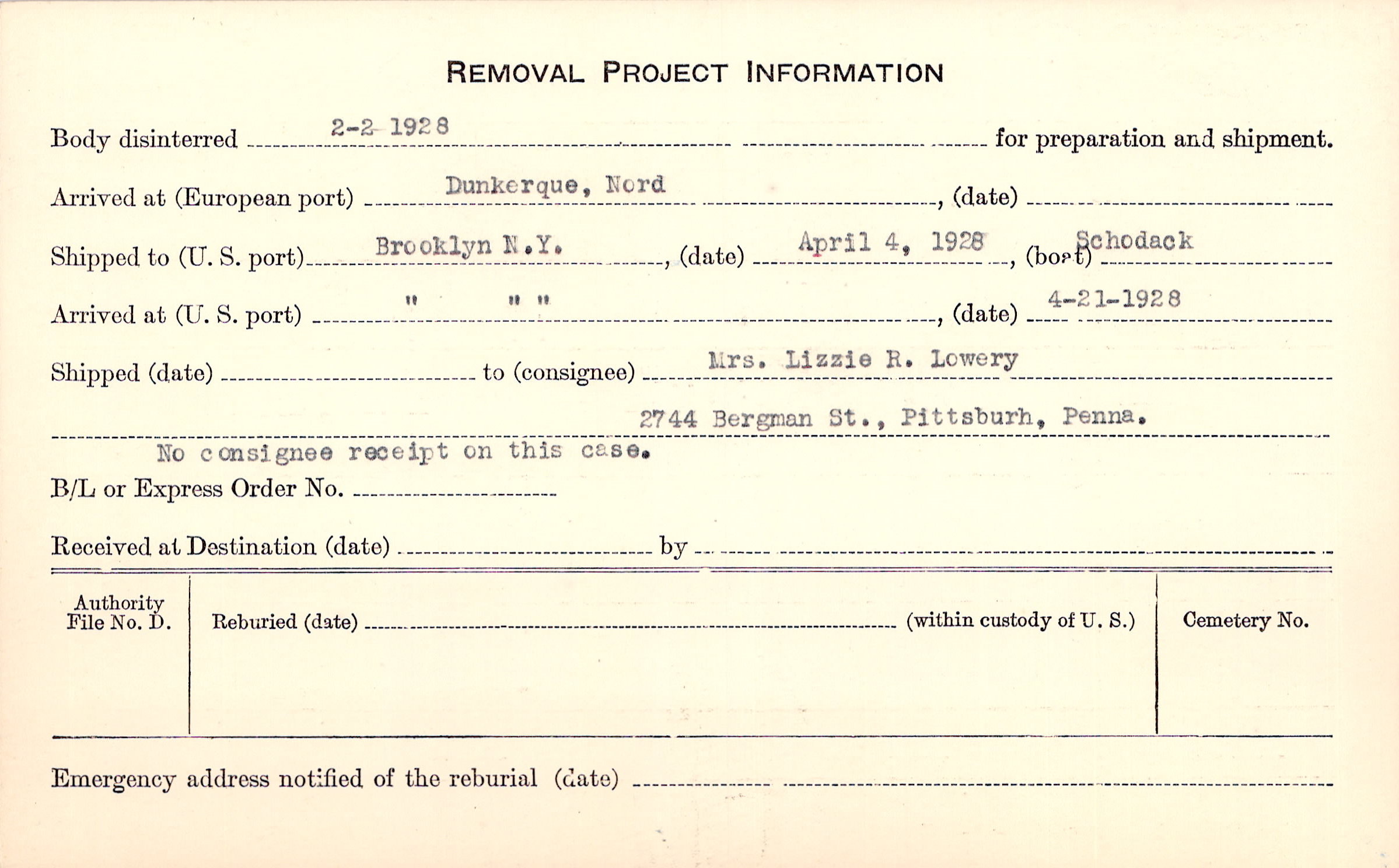 to Mrs. Lizzie R. Lowery, 2744 Bergman St., Pittsburgh, Penna., No consignee receipt on this case.