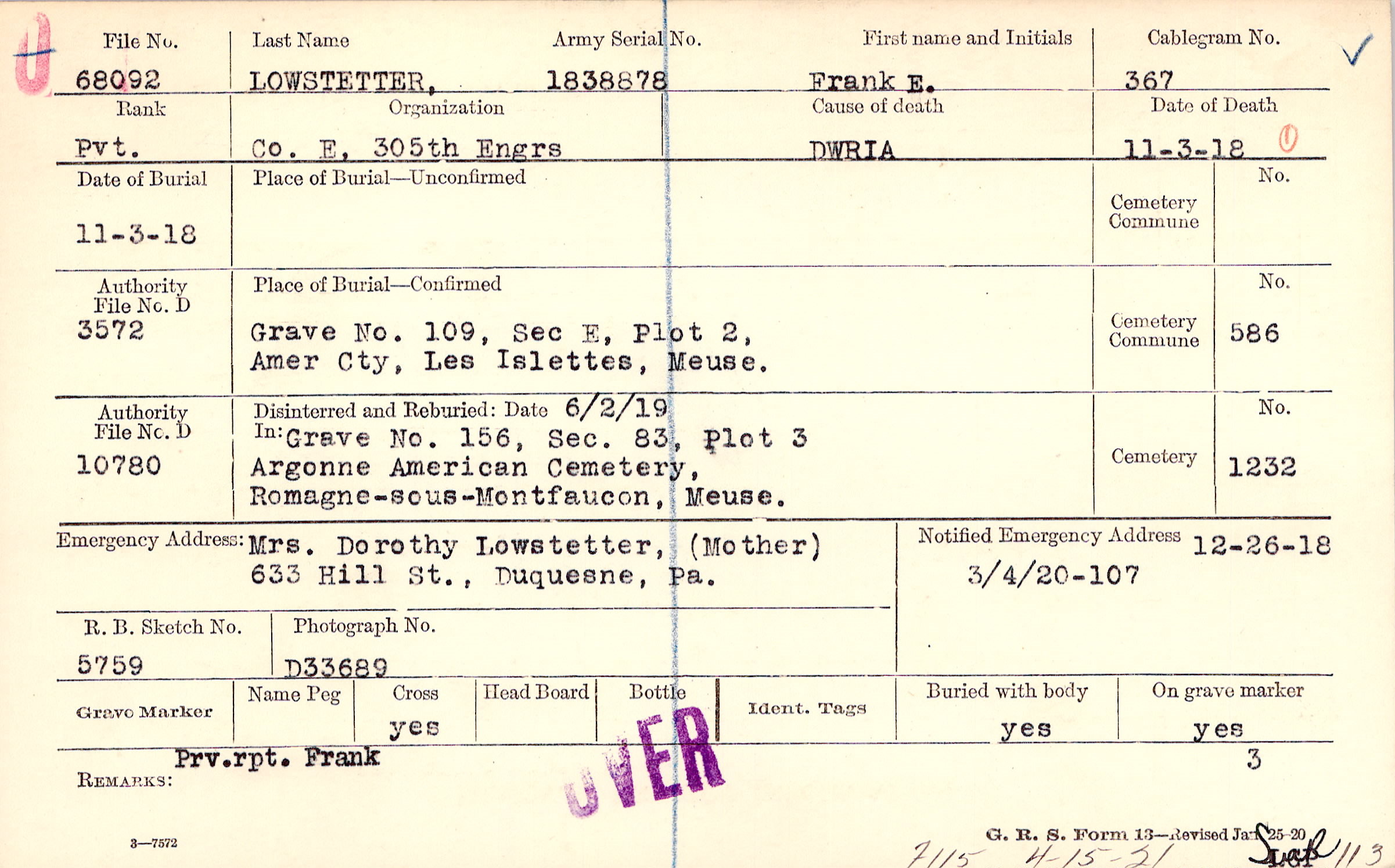 Mrs. Dorothy Lowstetter, (Mother), 633 Hill St., Duquesne, Pa.