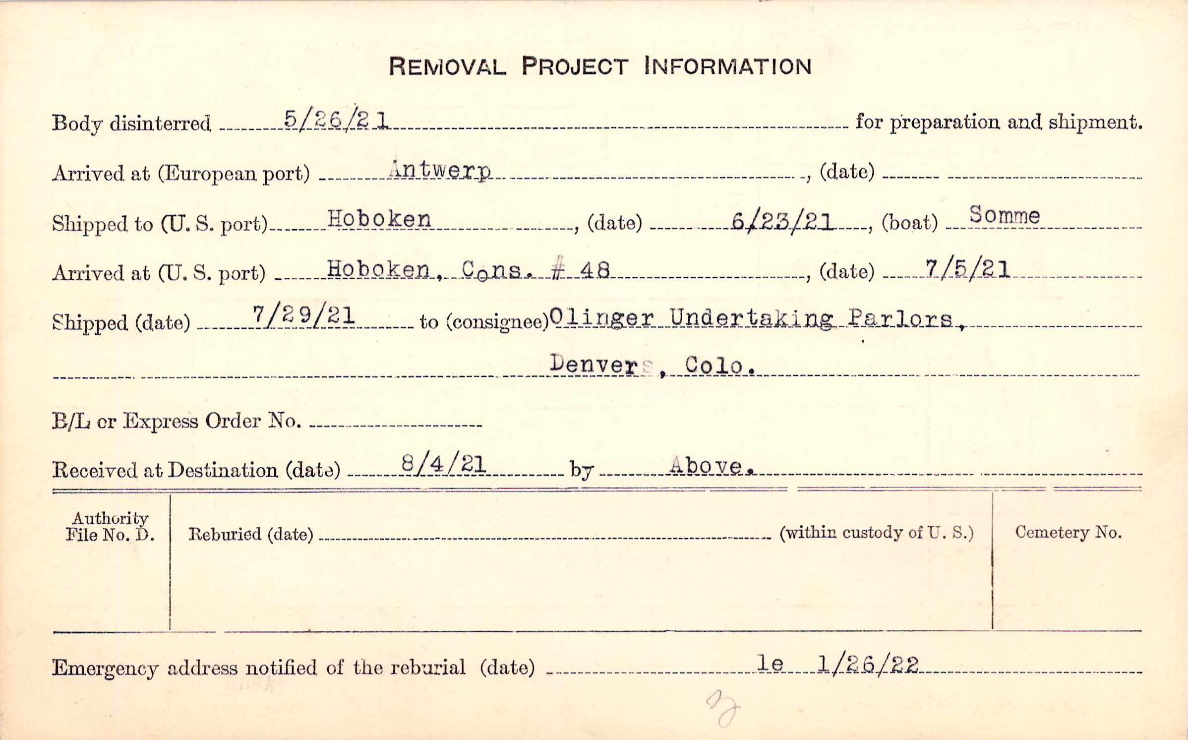 Body disinterred 5/26/1921 for preparation and shipment.