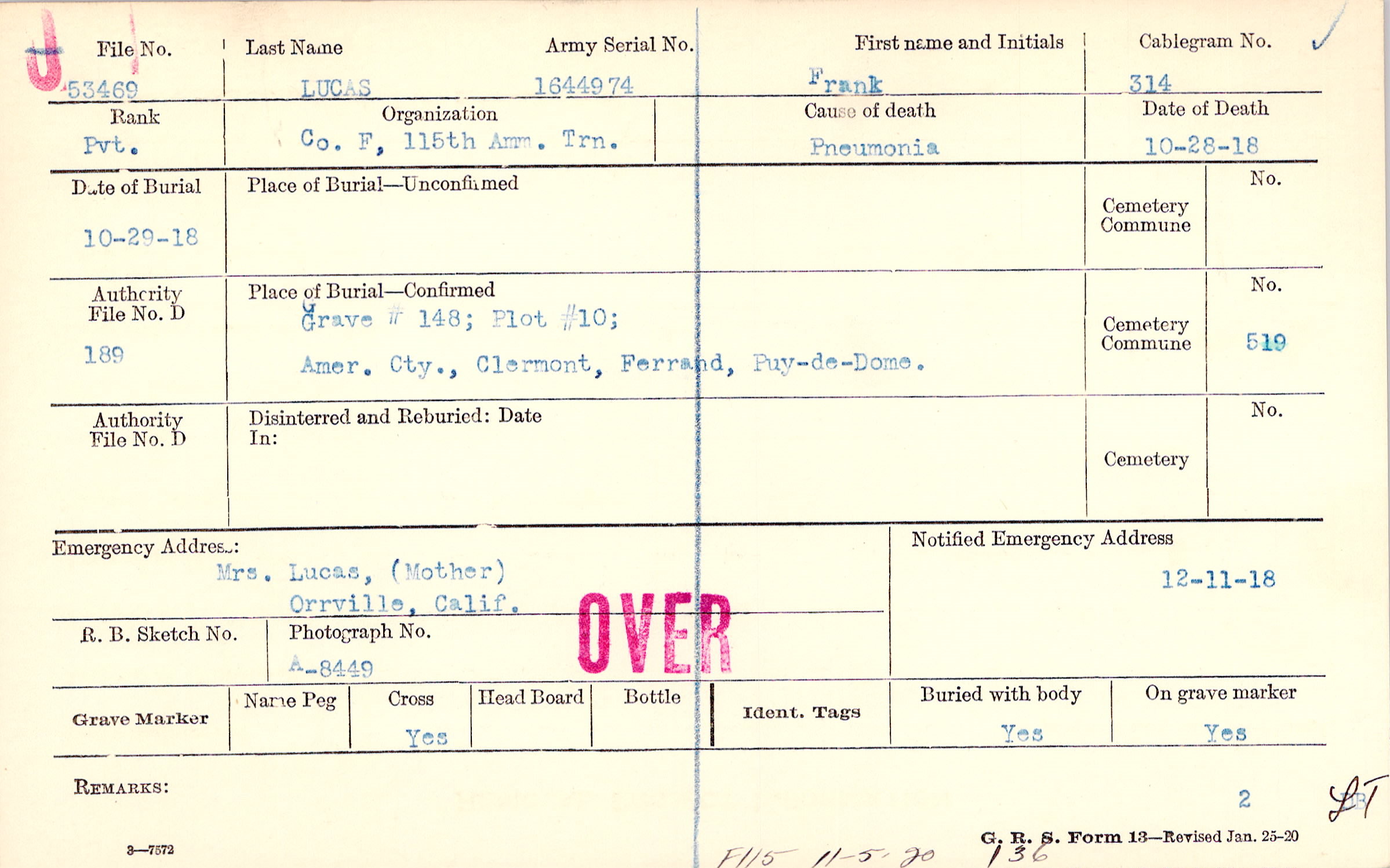 Grave #148, Plot #10, Amer. Cty., Clermont, Ferrand, Puy-de-Dome.