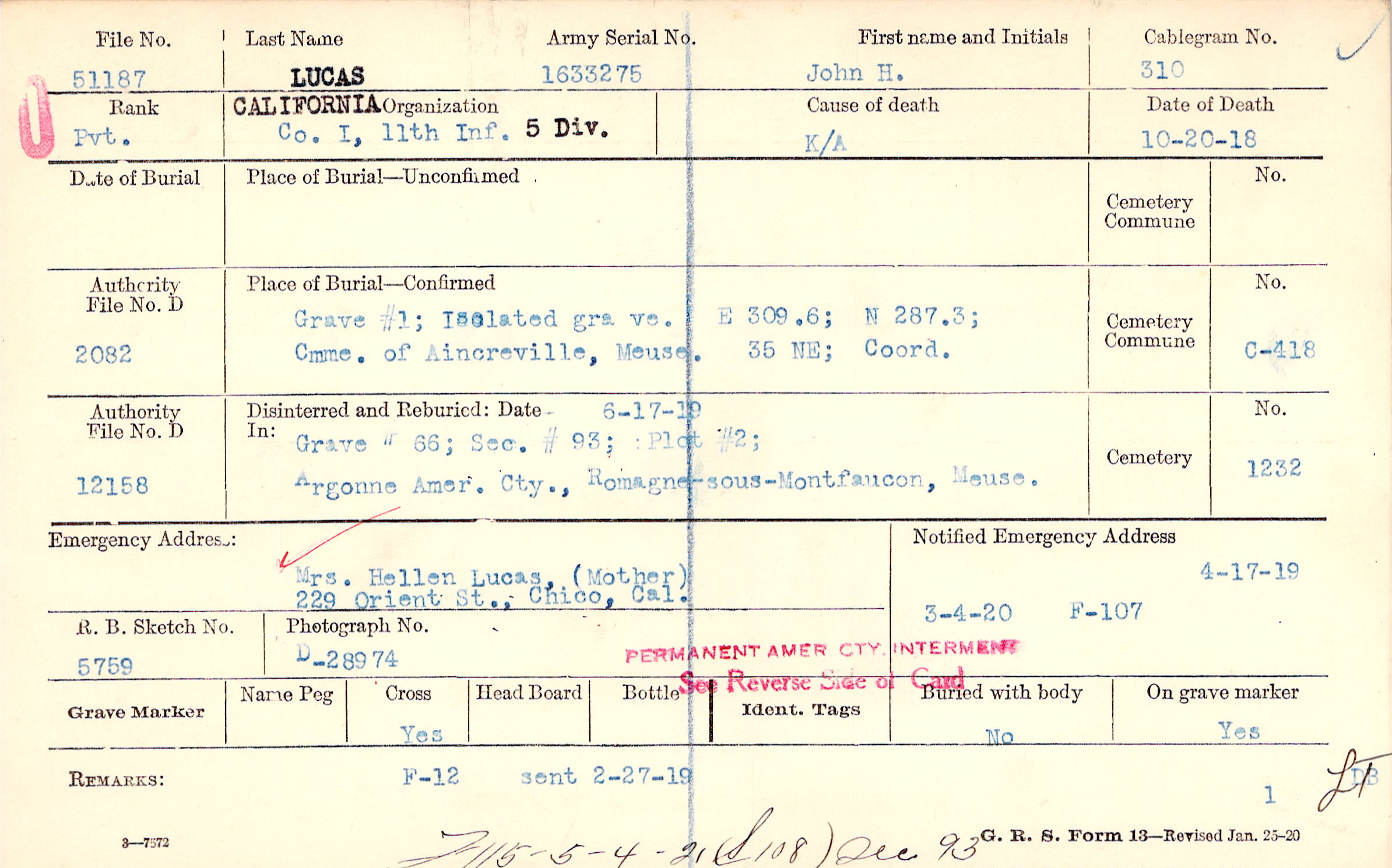 Mrs. Hellen Lucas, (Mother), 229 Orient St., Chico, Cal.