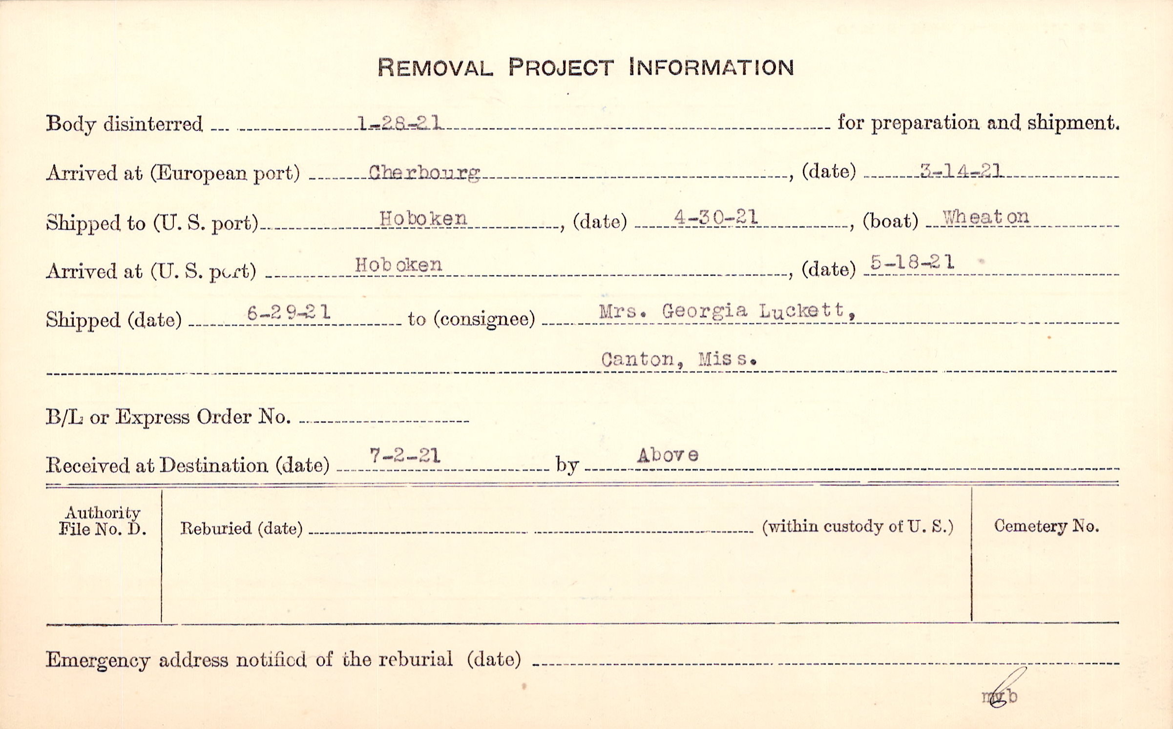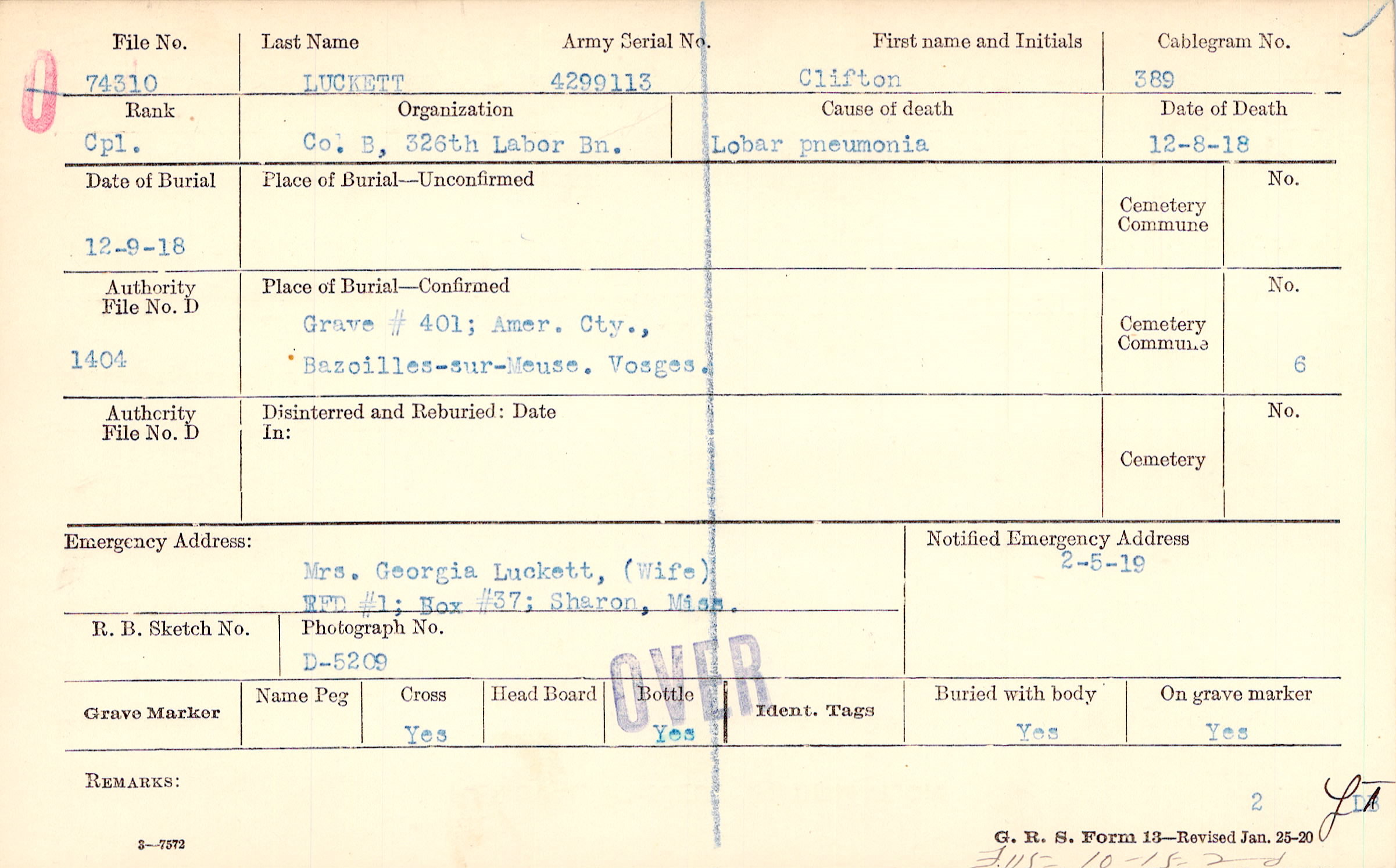 Mrs. Georgia Luckett, (Wife), RFD #1; Box #37; Sharon, Miss.