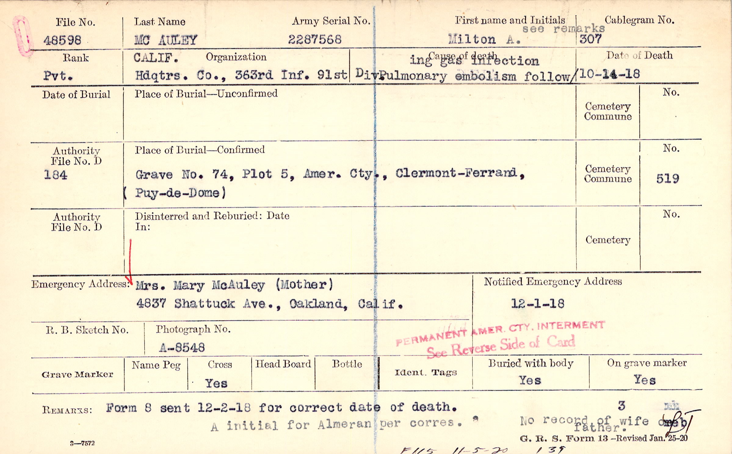 Mrs. Mary McAuley (Mother), 4837 Shattuck Ave., Oakland, Calif.