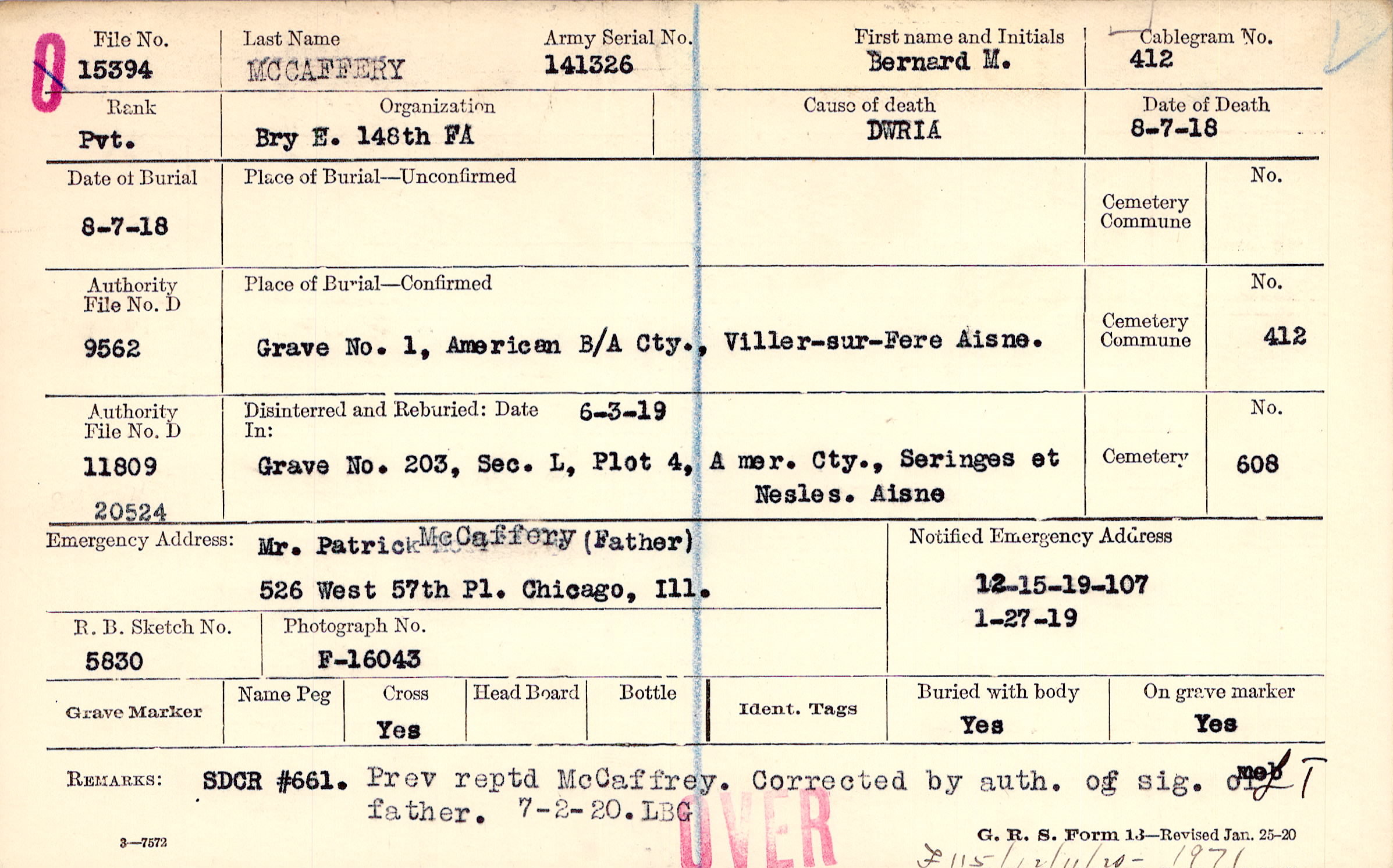 Prev reptd McCaffrey. Corrected by auth of sig. of father. 7-2-20.LBG, F115 / 12/11/20 - 1971, SDCR #661