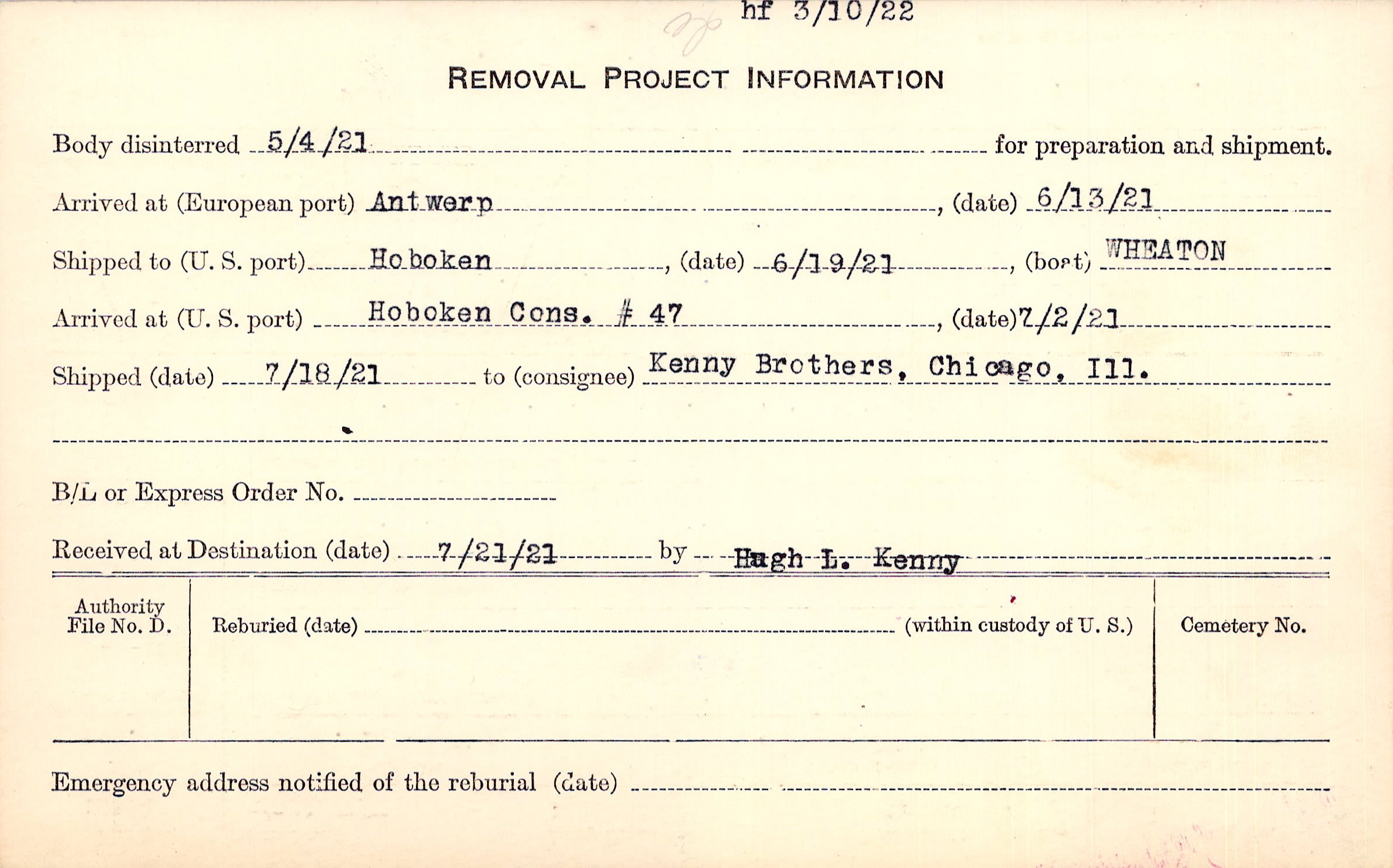 Body disinterred 5/4/1921 for preparation and shipment.