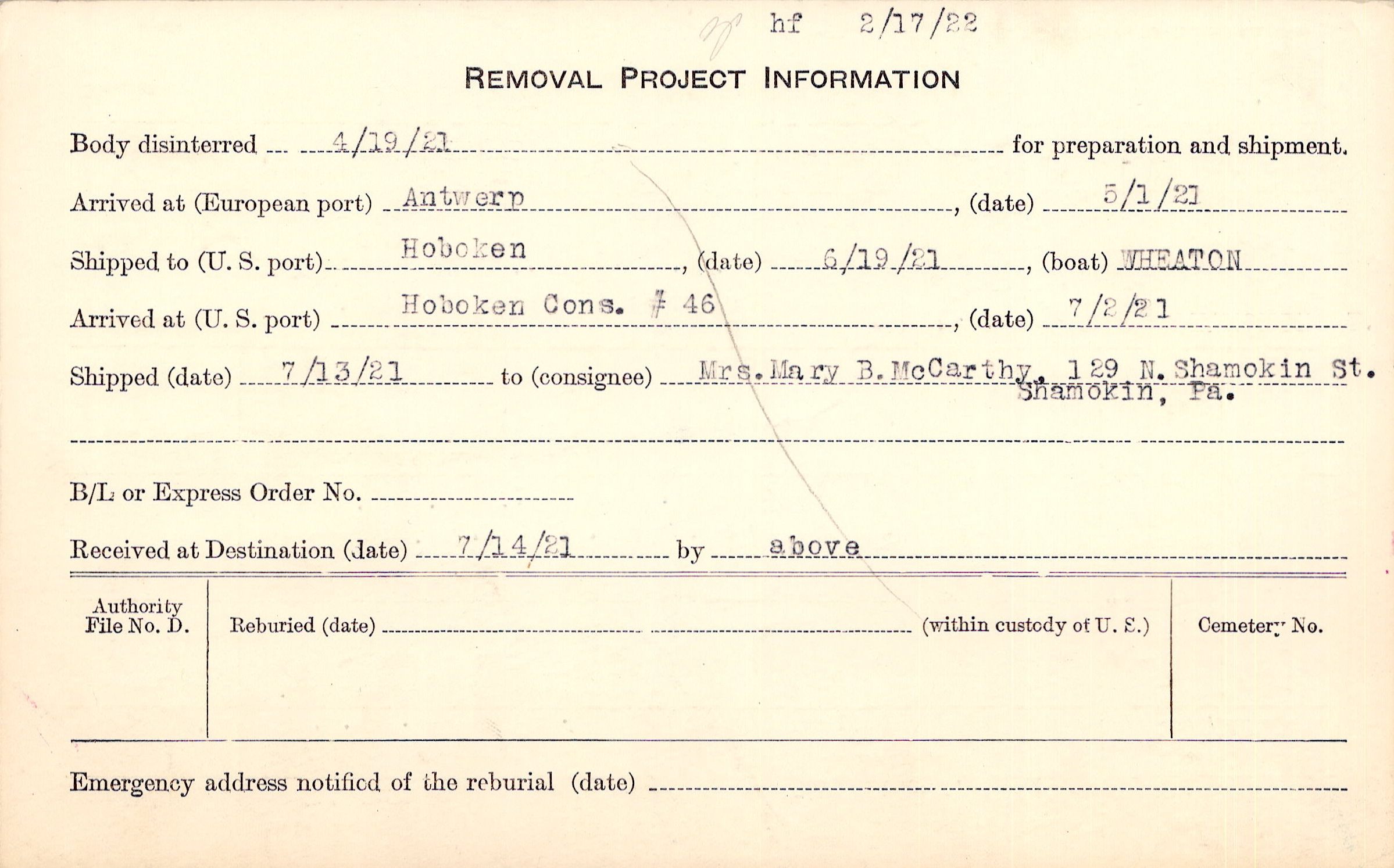 Body disinterred 4/19/1921 for preparation and shipment.