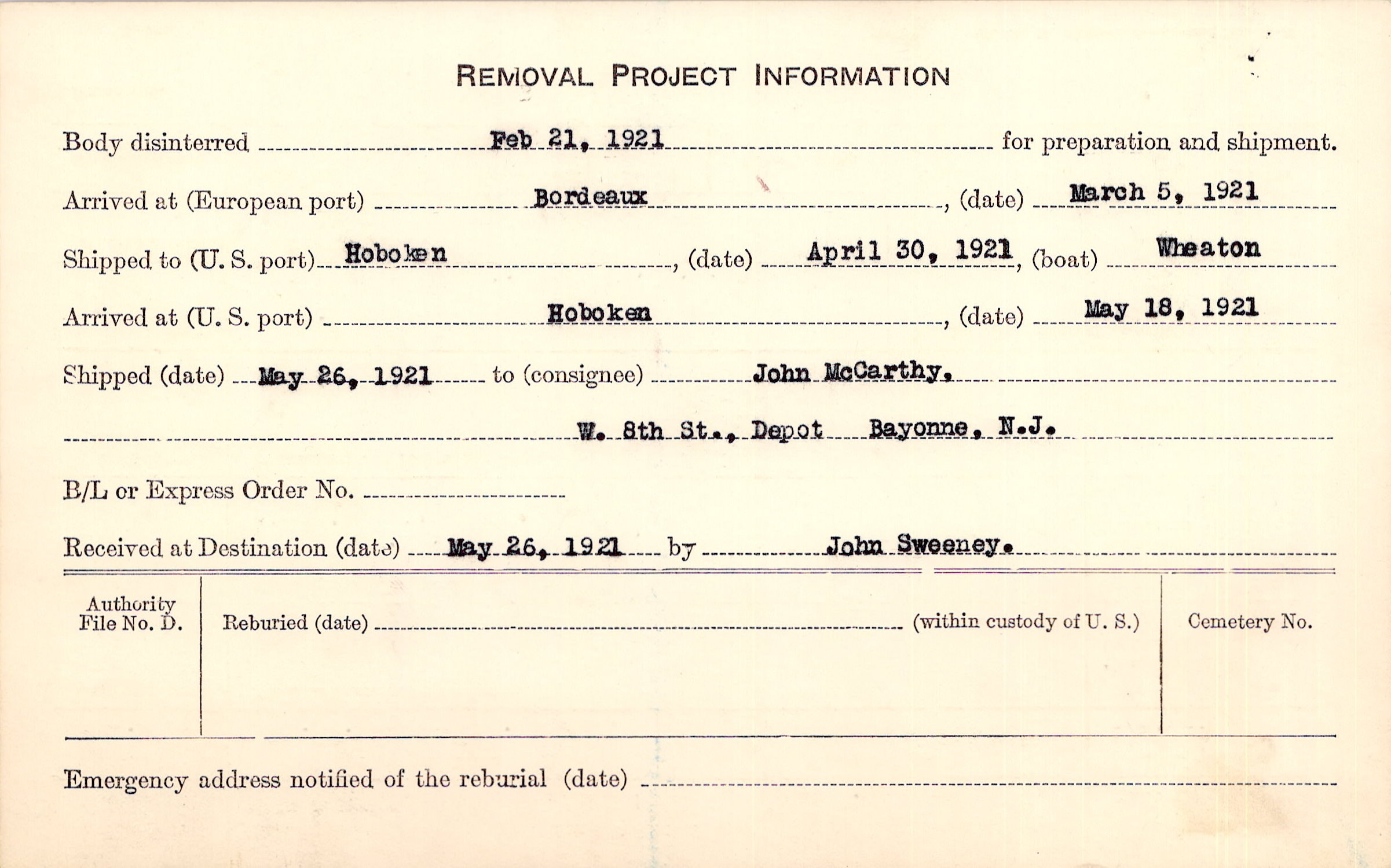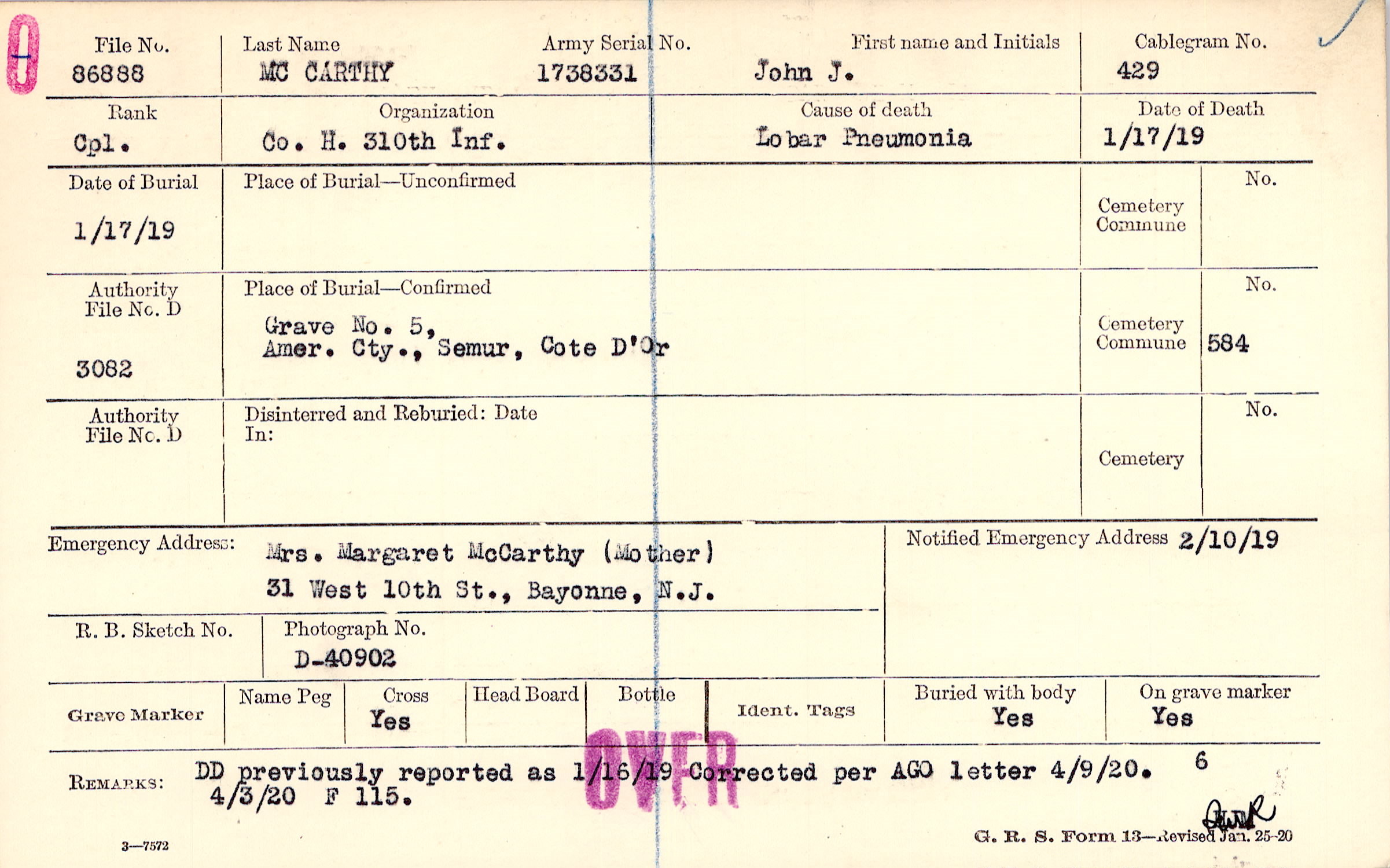 Mrs. Margaret McCarthy (Mother), 31 West 10th St., Bayonne, N.J.