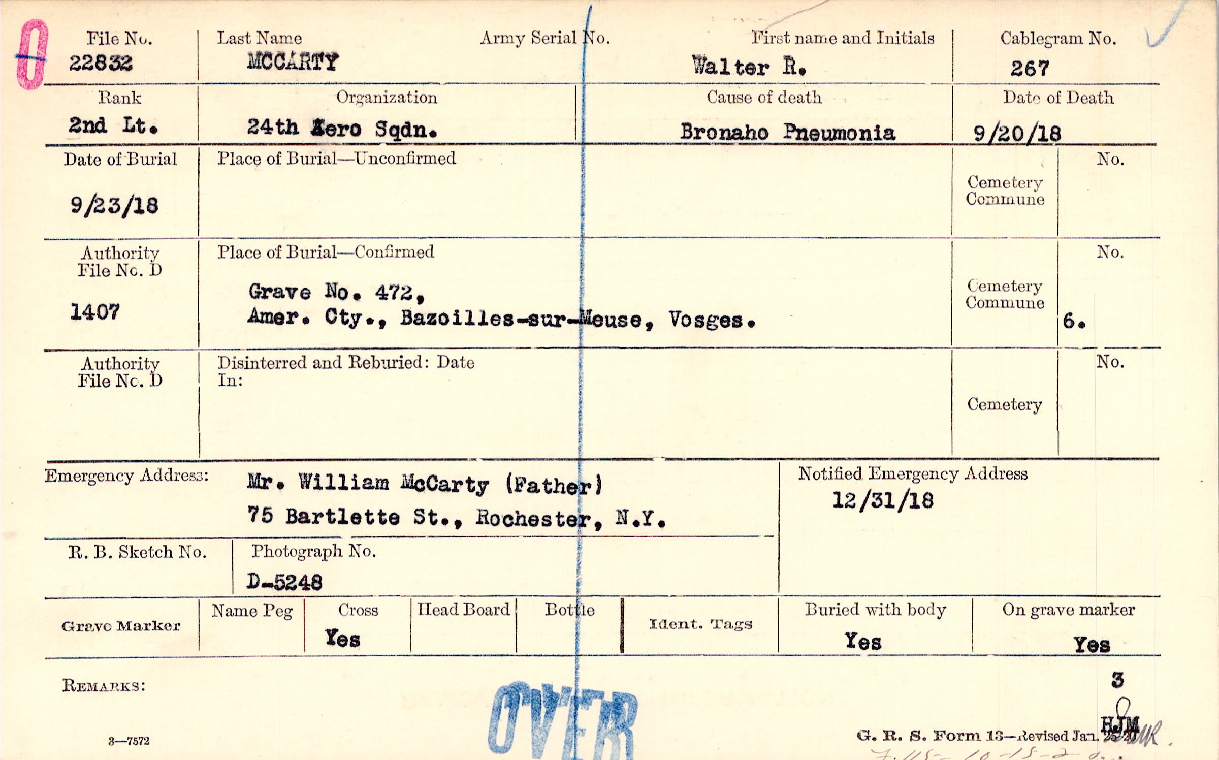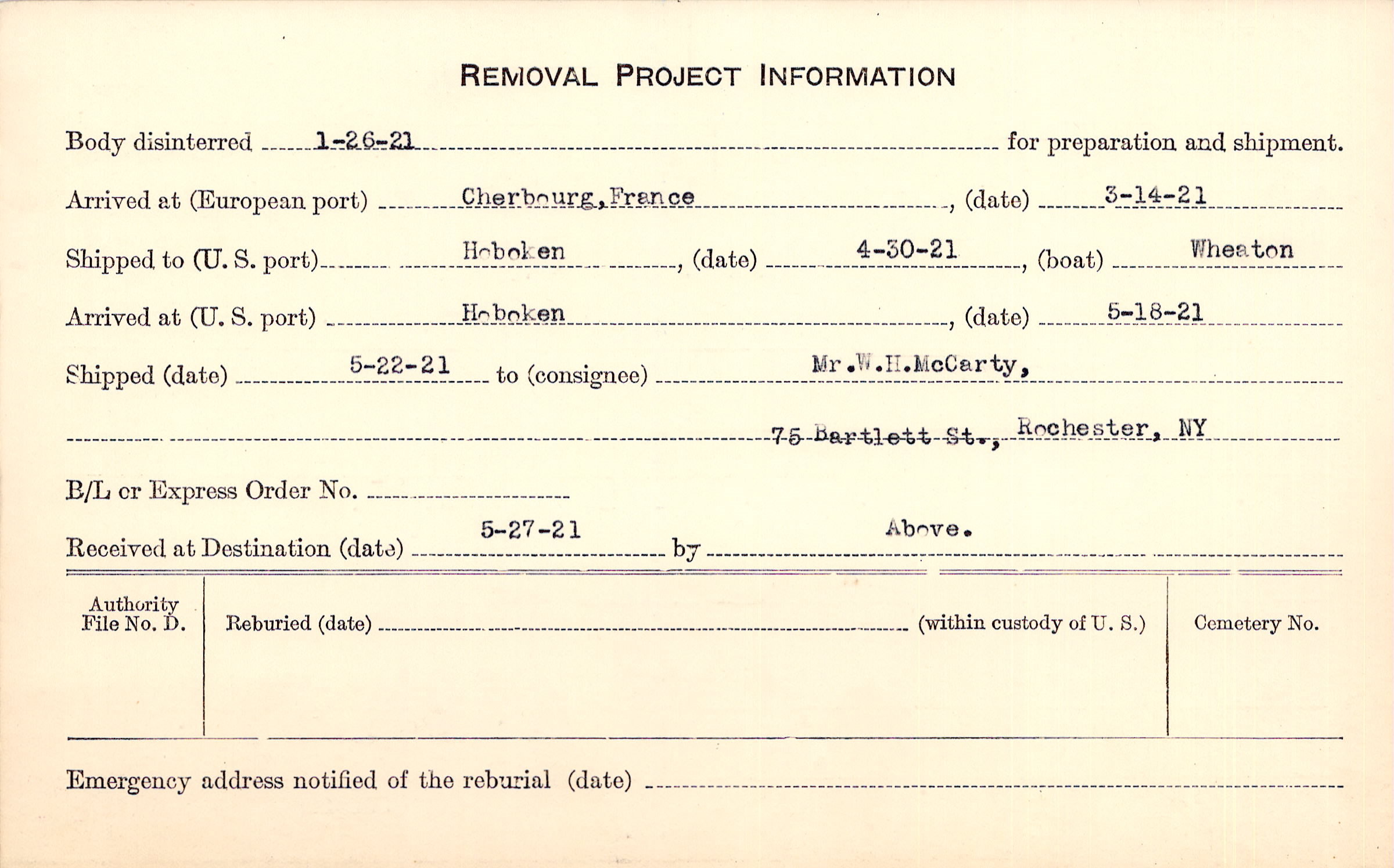 Mr. William McCarty (Father), 75 Bartlette St., Rochester, N.Y.