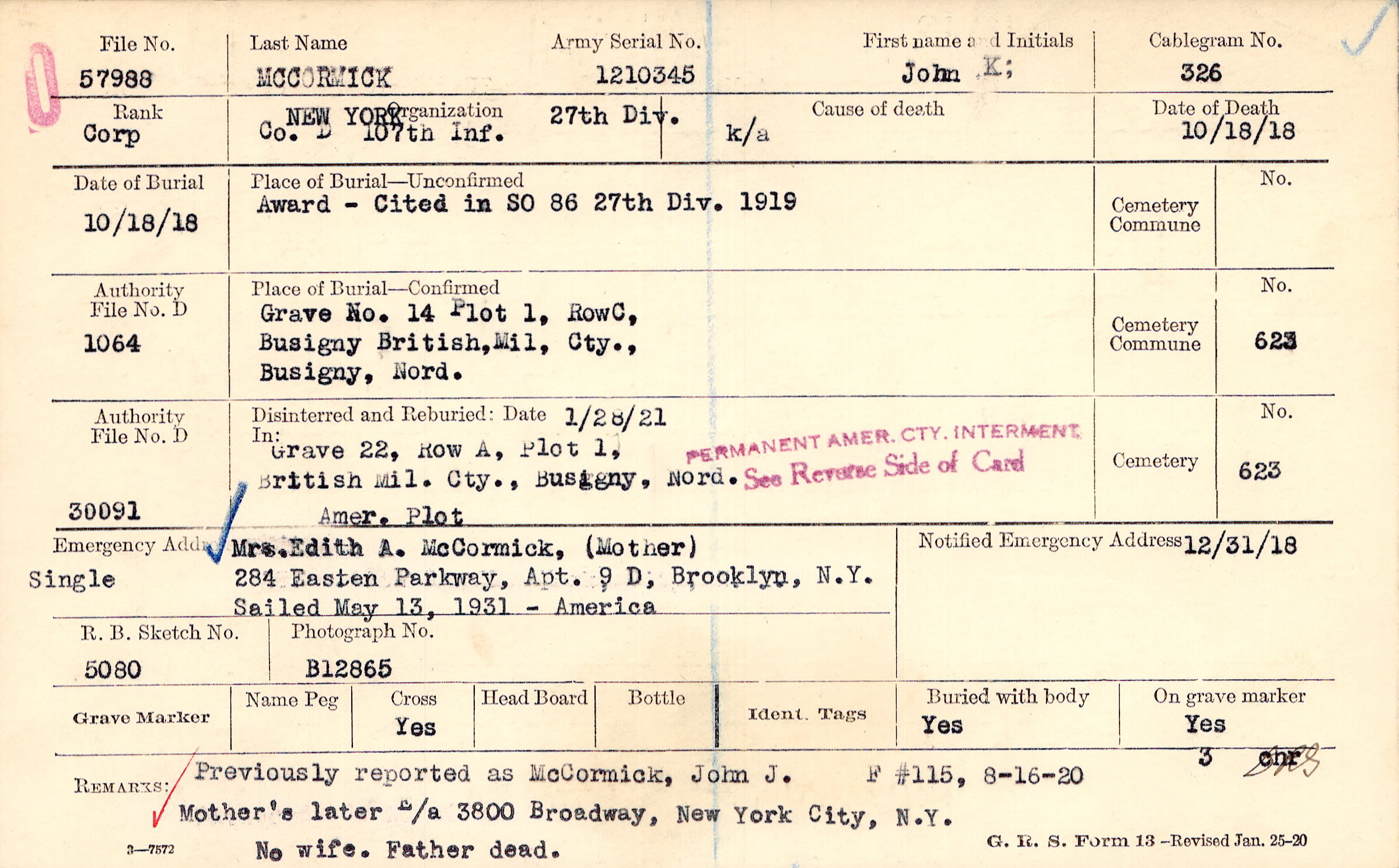 Previously reported as McCormick, John J. Mother's later E/a 3800 Broadway, New York City, N.Y. No wife. Father dead, F #115, 8-16-20