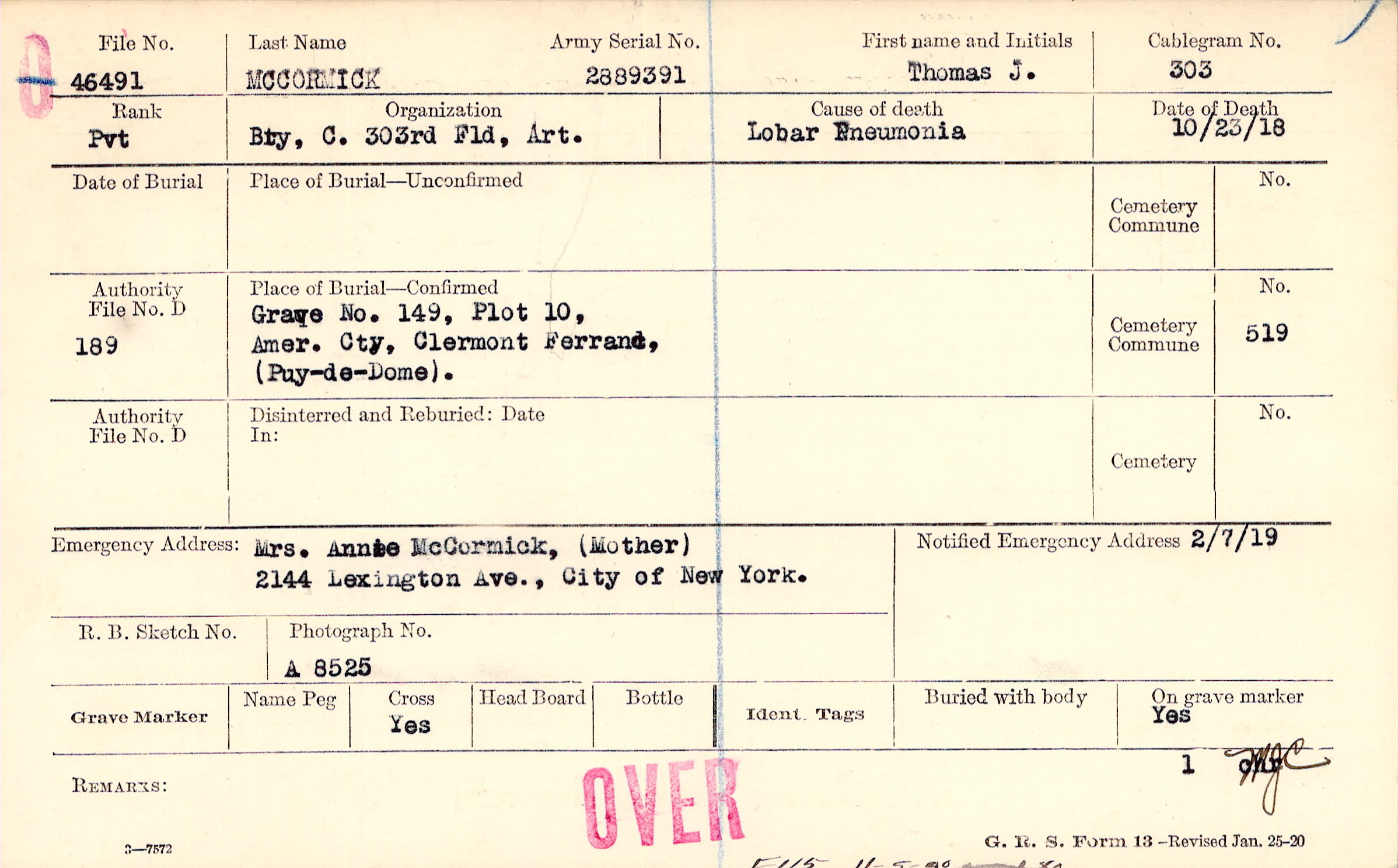 Mrs. Annie McCormick, (Mother), 2144 Lexington Ave., City of New York.