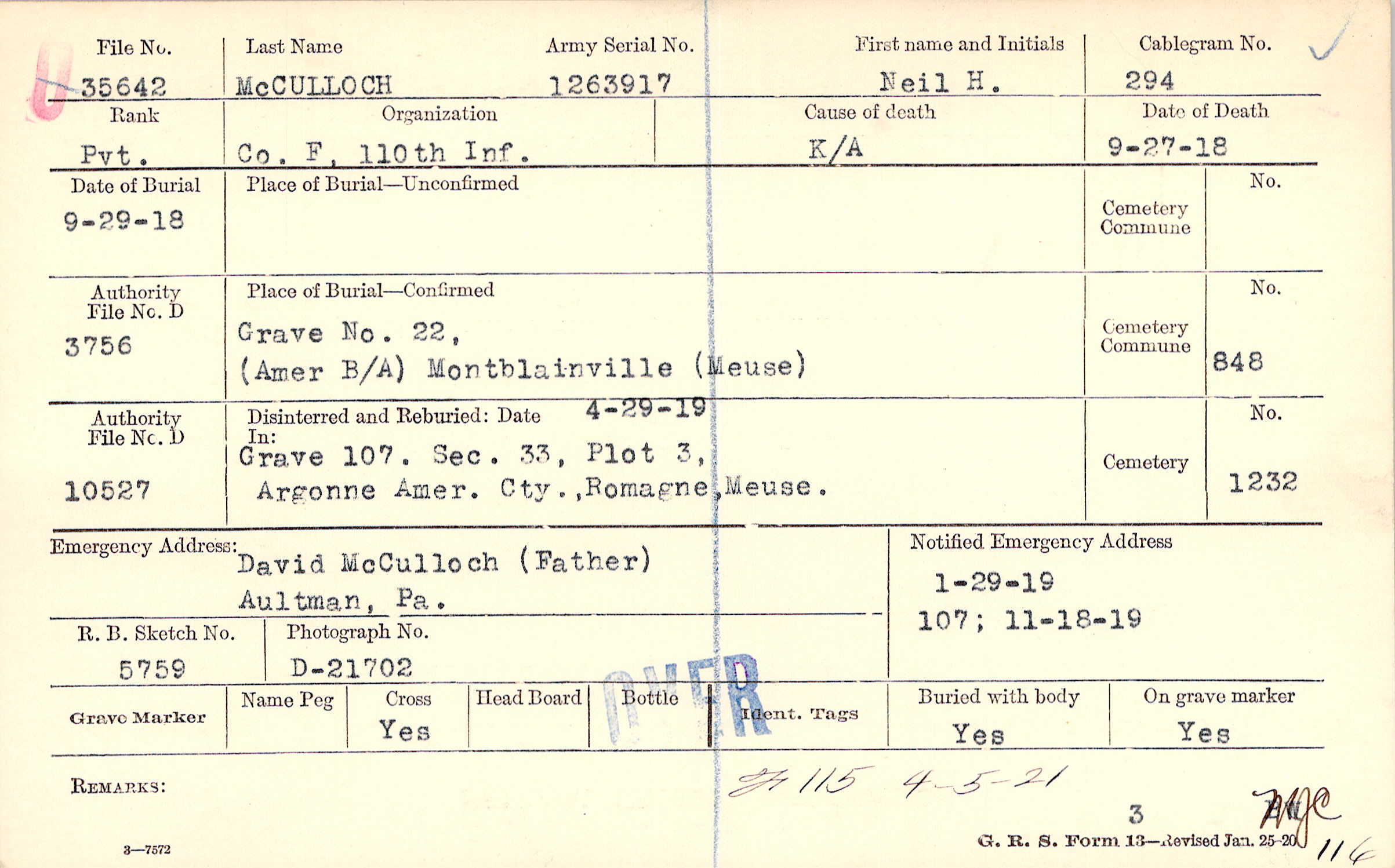 Grave 107, Section 33, Plot 3, Argonne American Cemetery, Romagne-sous-Montfaucon, Meuse