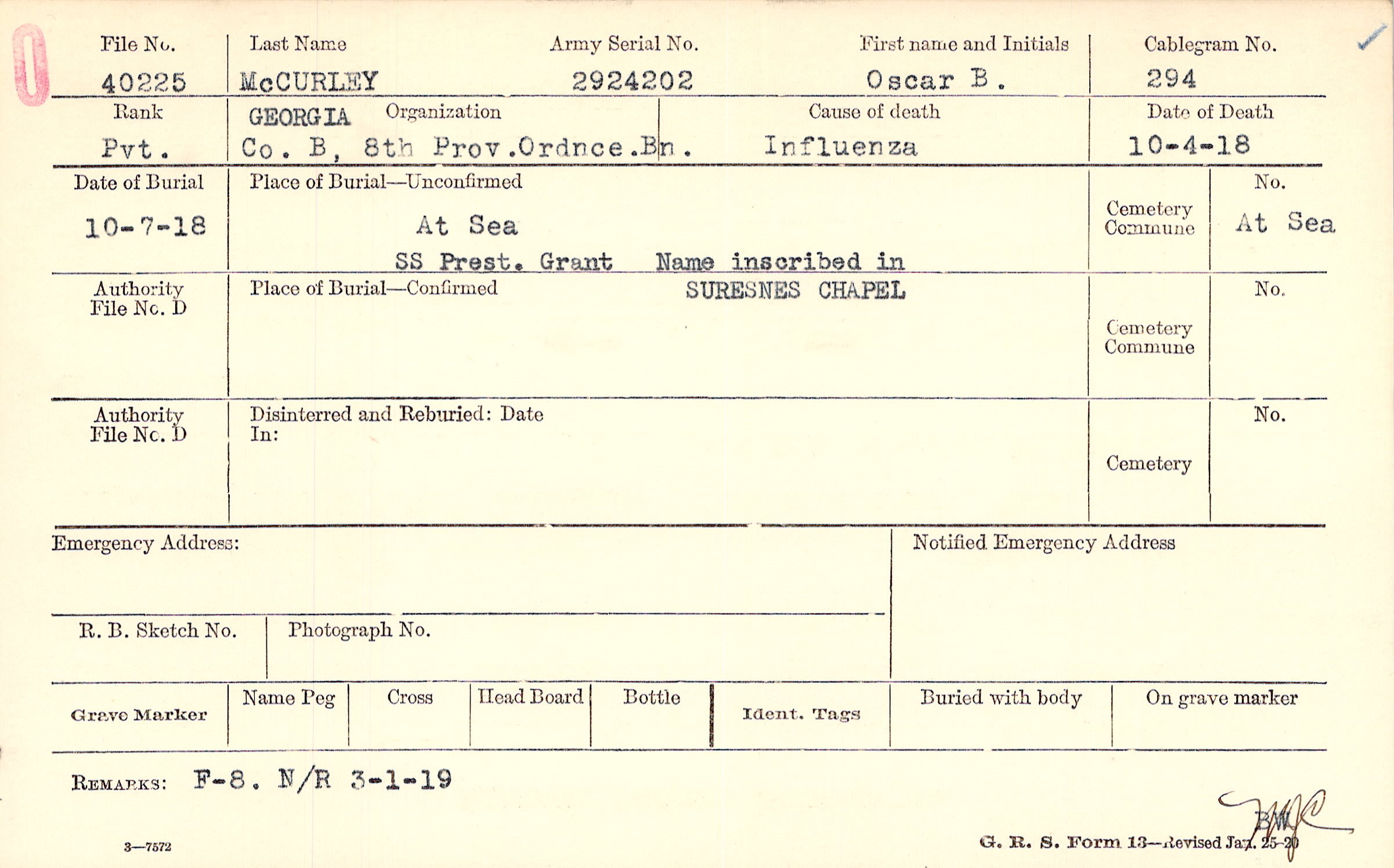 At Sea, SS Prest. Grant, Name inscribed in SURESNES CHAPEL