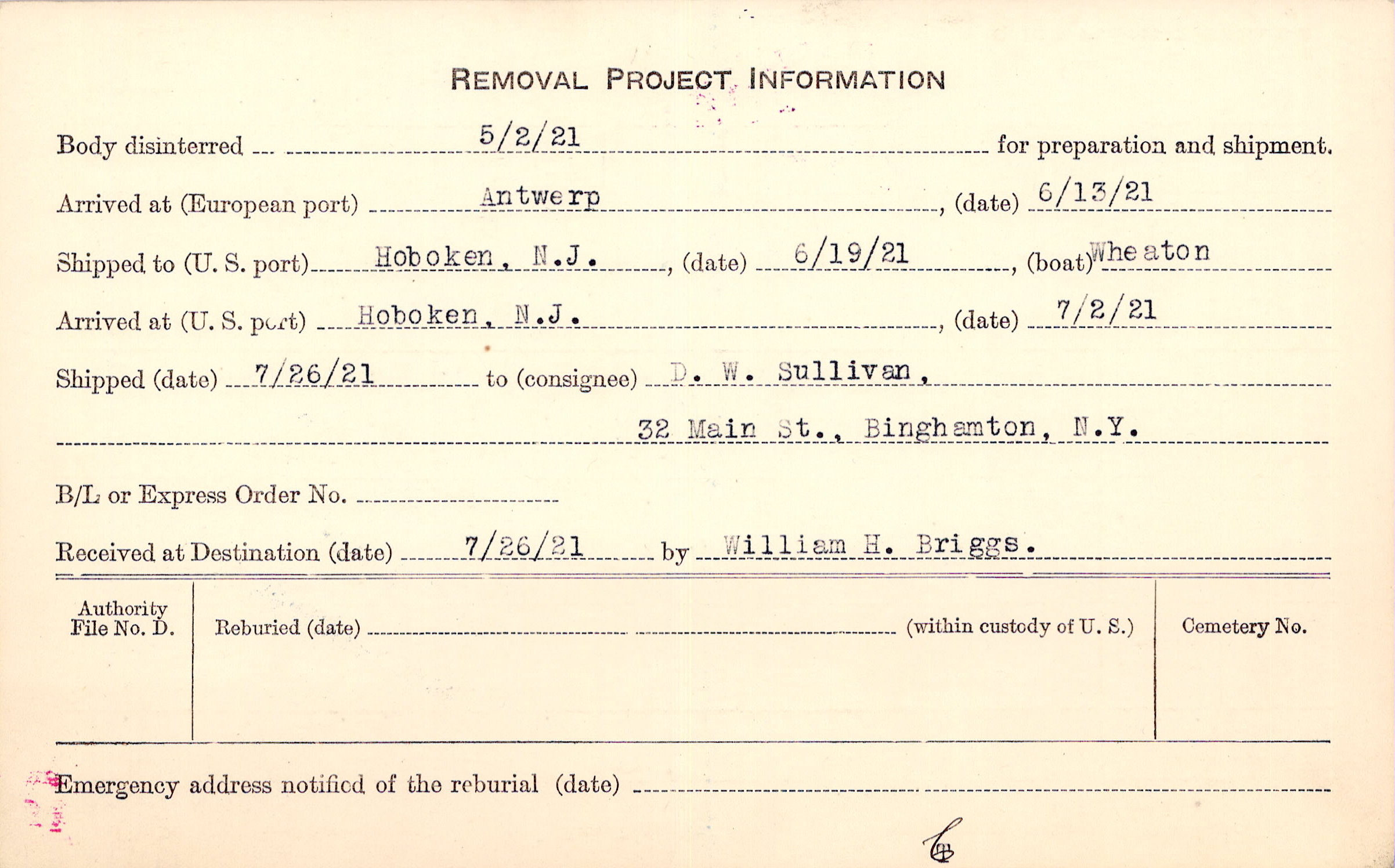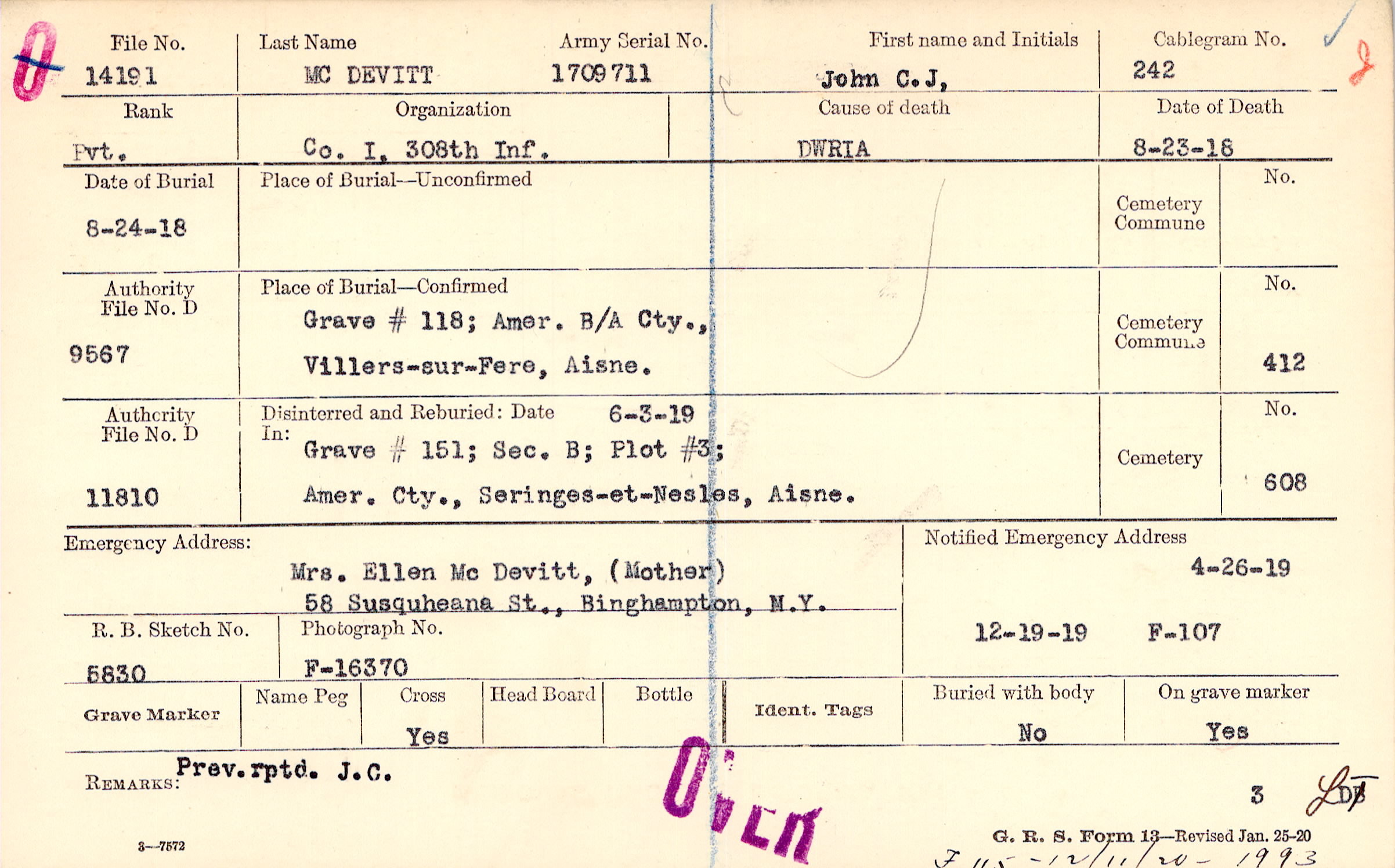 Mrs. Ellen Mc Devitt, (Mother), 58 Susquheana St., Binghampton, N.Y.
