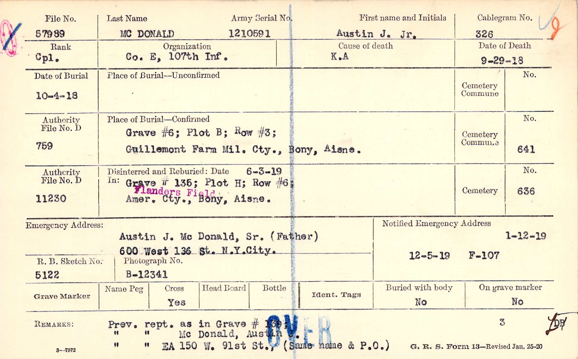Austin J. Mc Donald, Sr. (Father), 600 West 136 St. N.Y. City.
