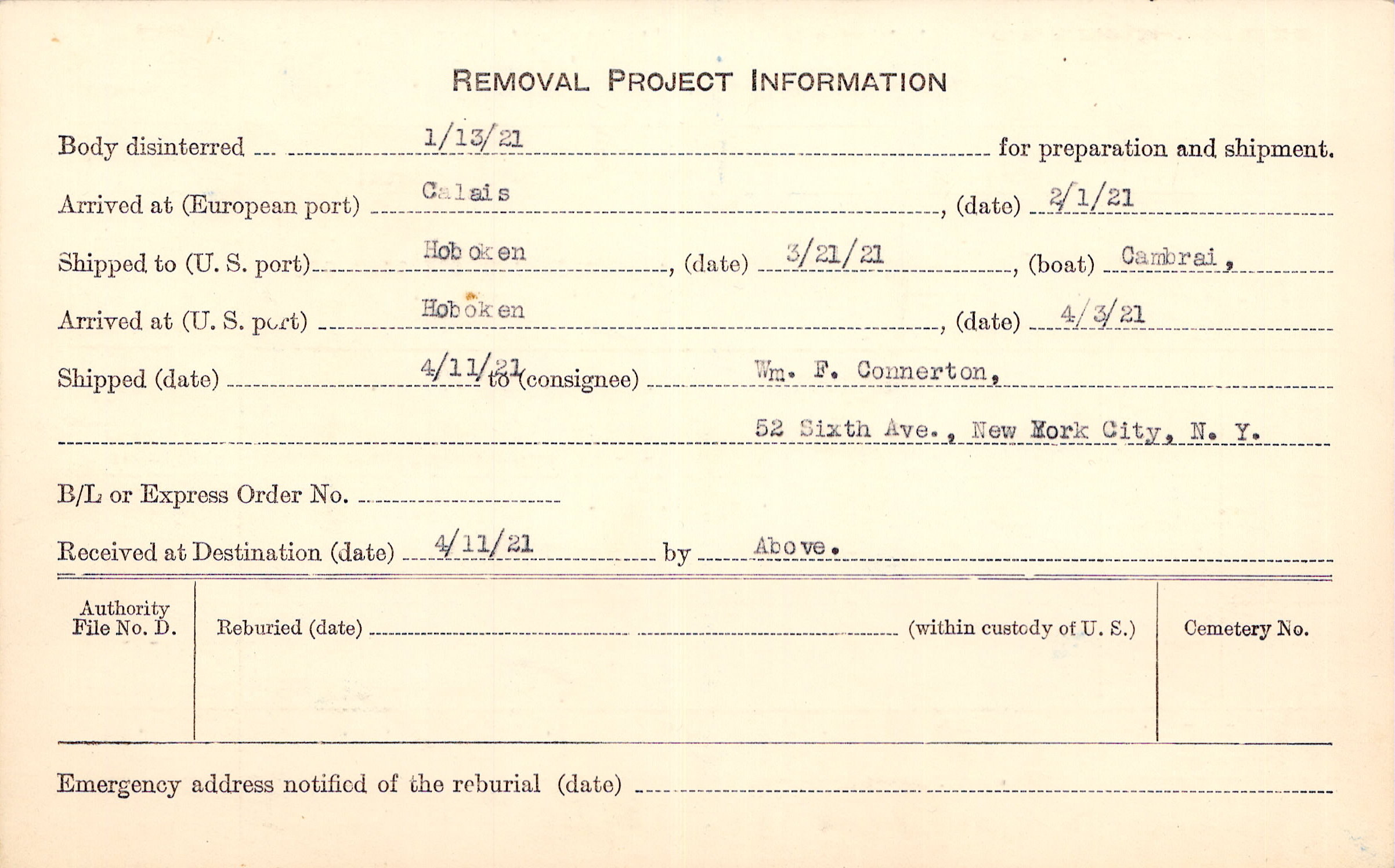 Body disinterred 1/13/1921 for preparation and shipment.