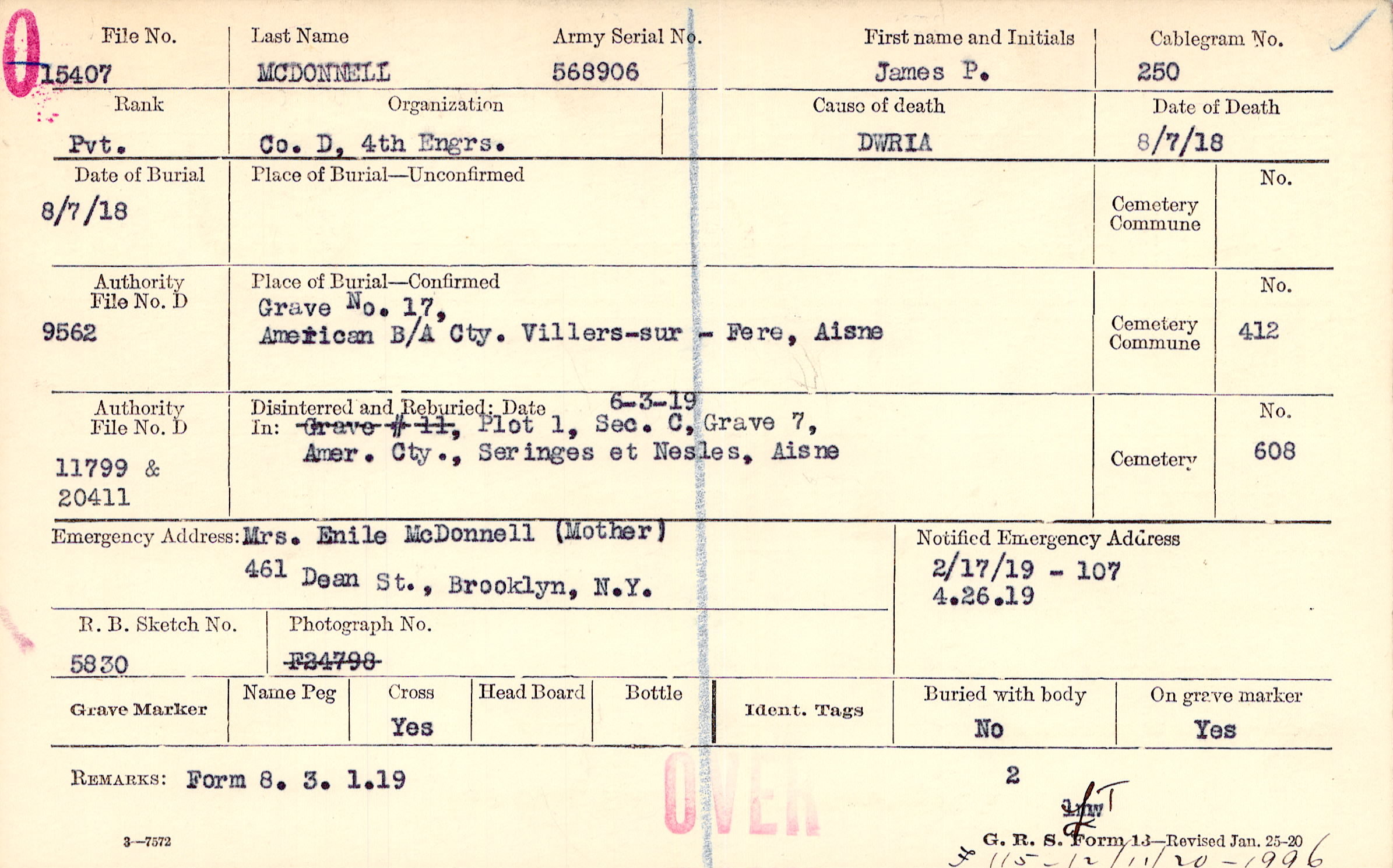 Mrs. Enile McDonnell (Mother), 461 Dean St., Brooklyn, N.Y.