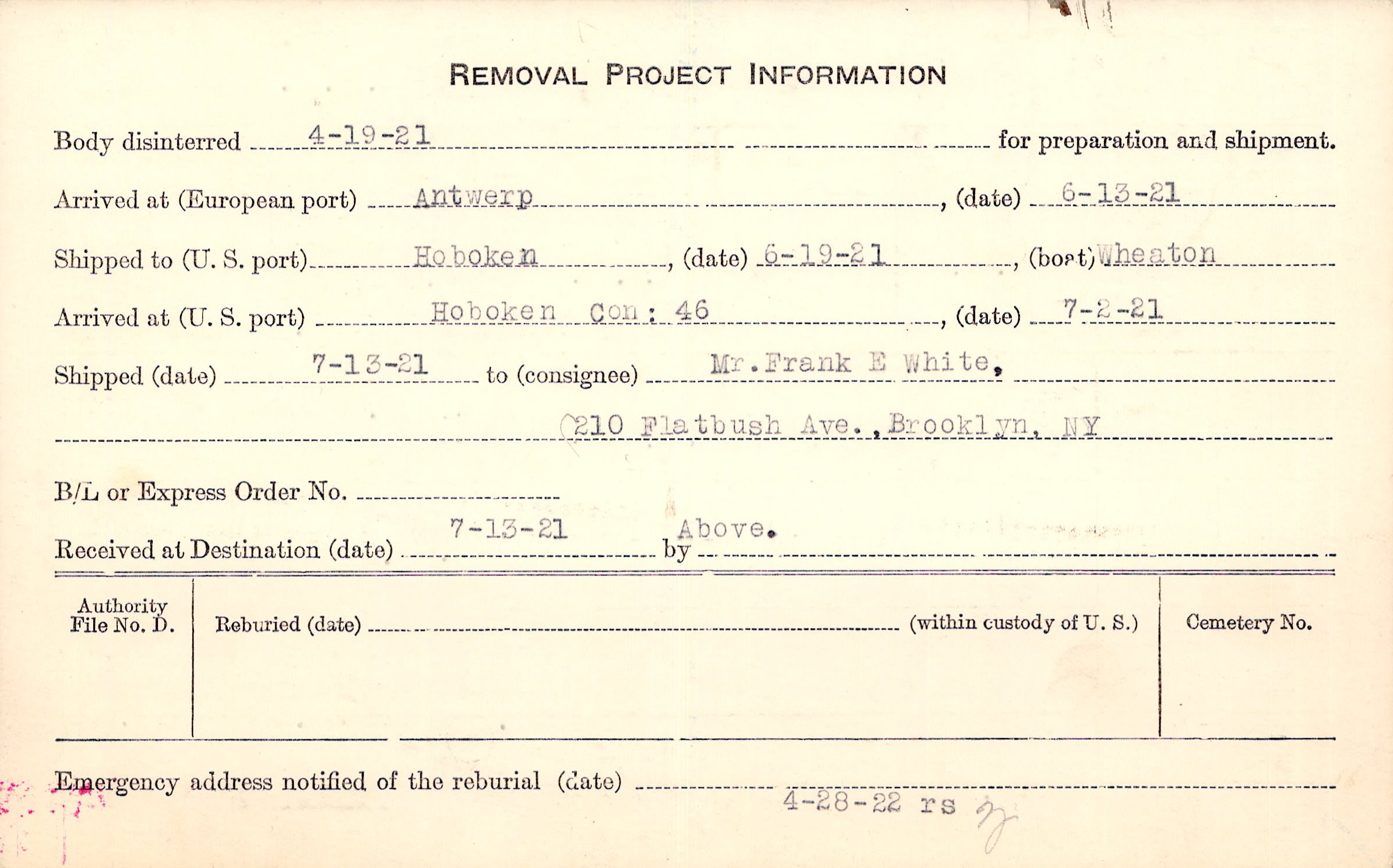 Body disinterred 4/19/1921 for preparation and shipment.